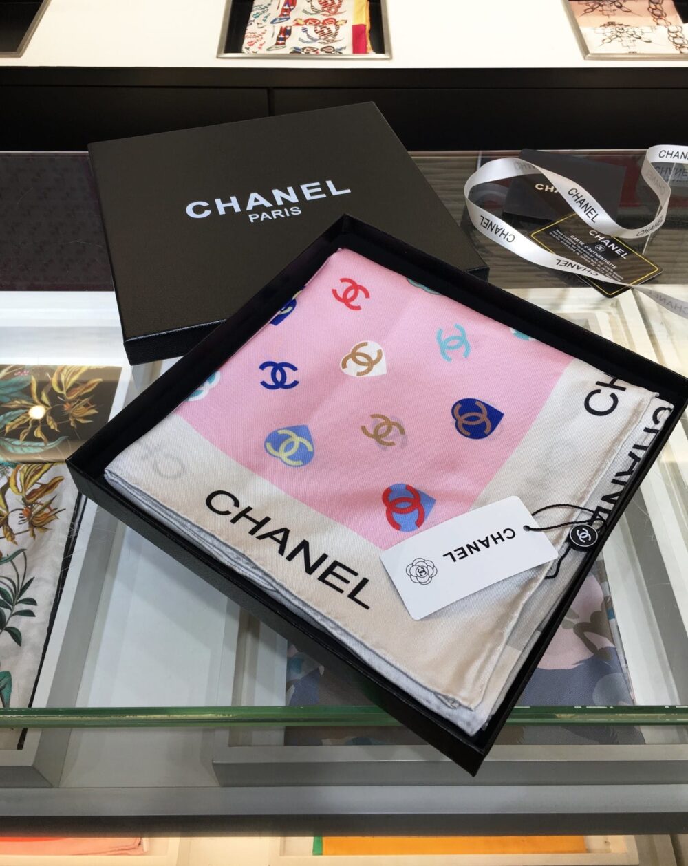 CHANEL MULTI LETTERS SQUARE SILK SCARF PINK BLUE