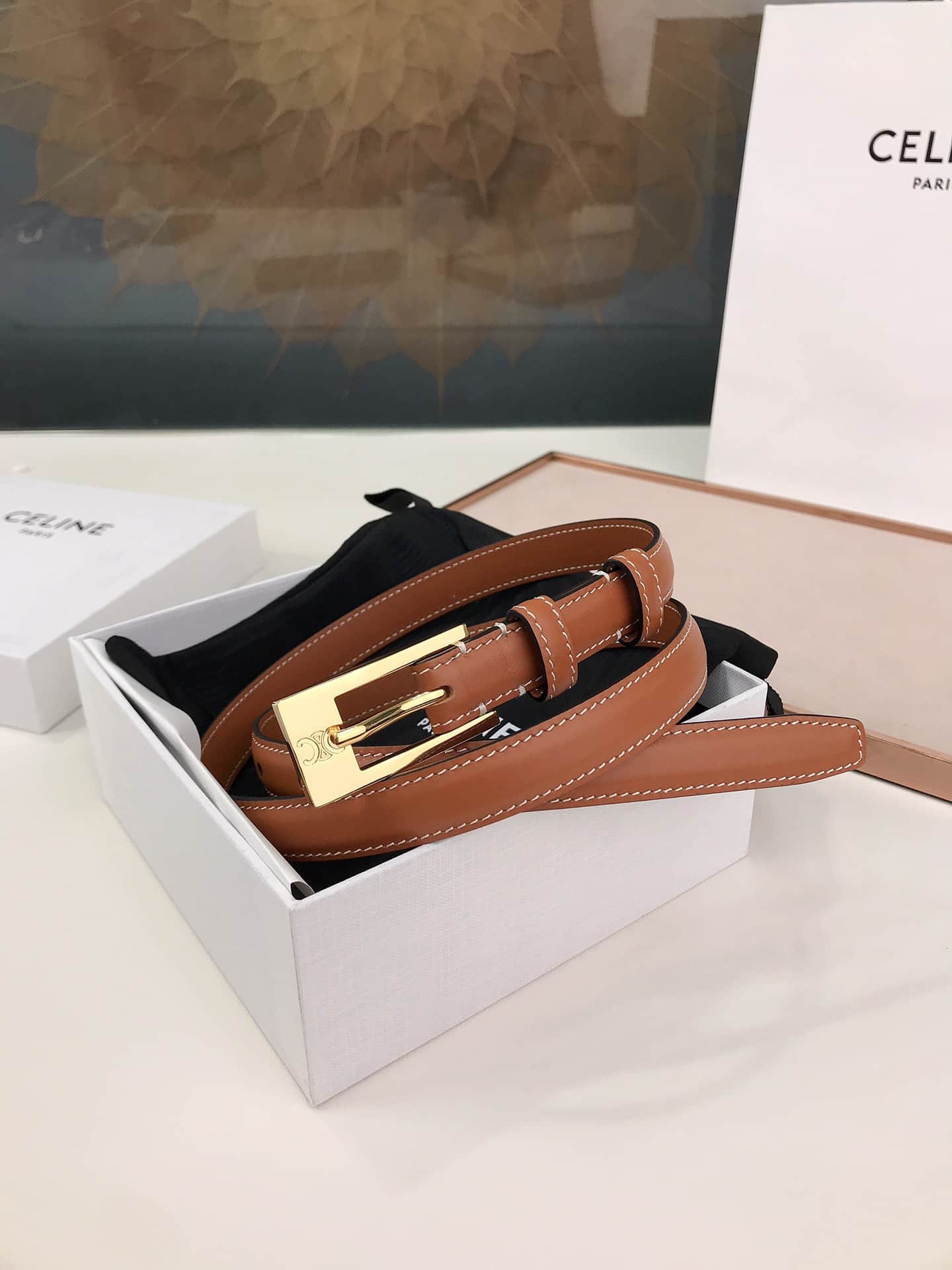 CELINE LEATHER BELT BROWN 1.8CM