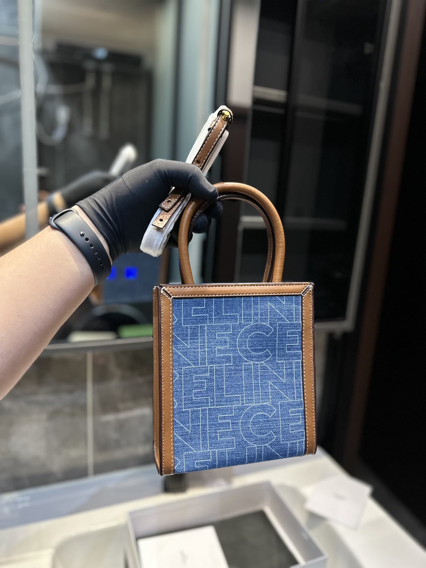 Celine //Mini Vertical Cabas Celine In Denim With Celine All Over Print //Navy Tan //21cm