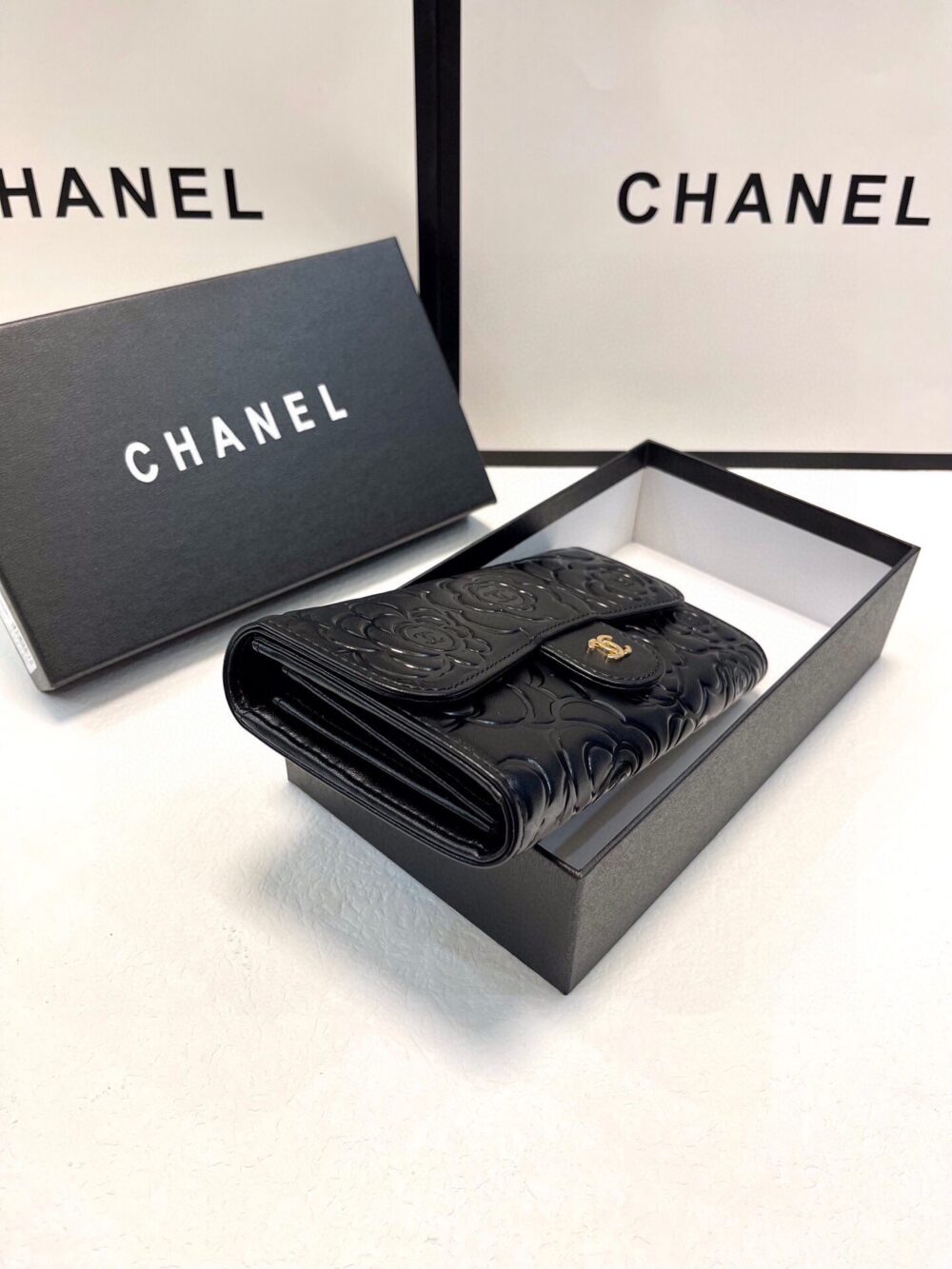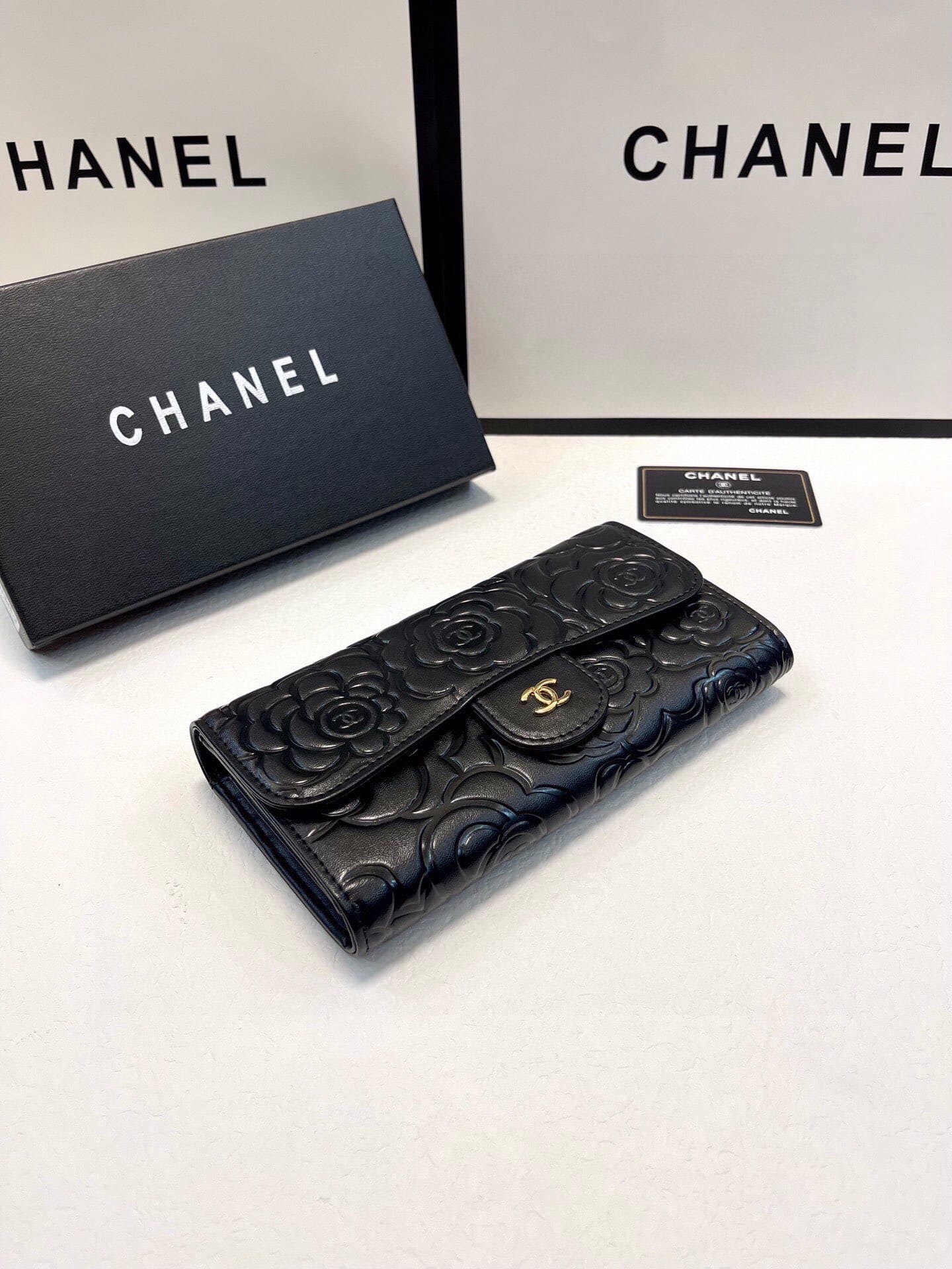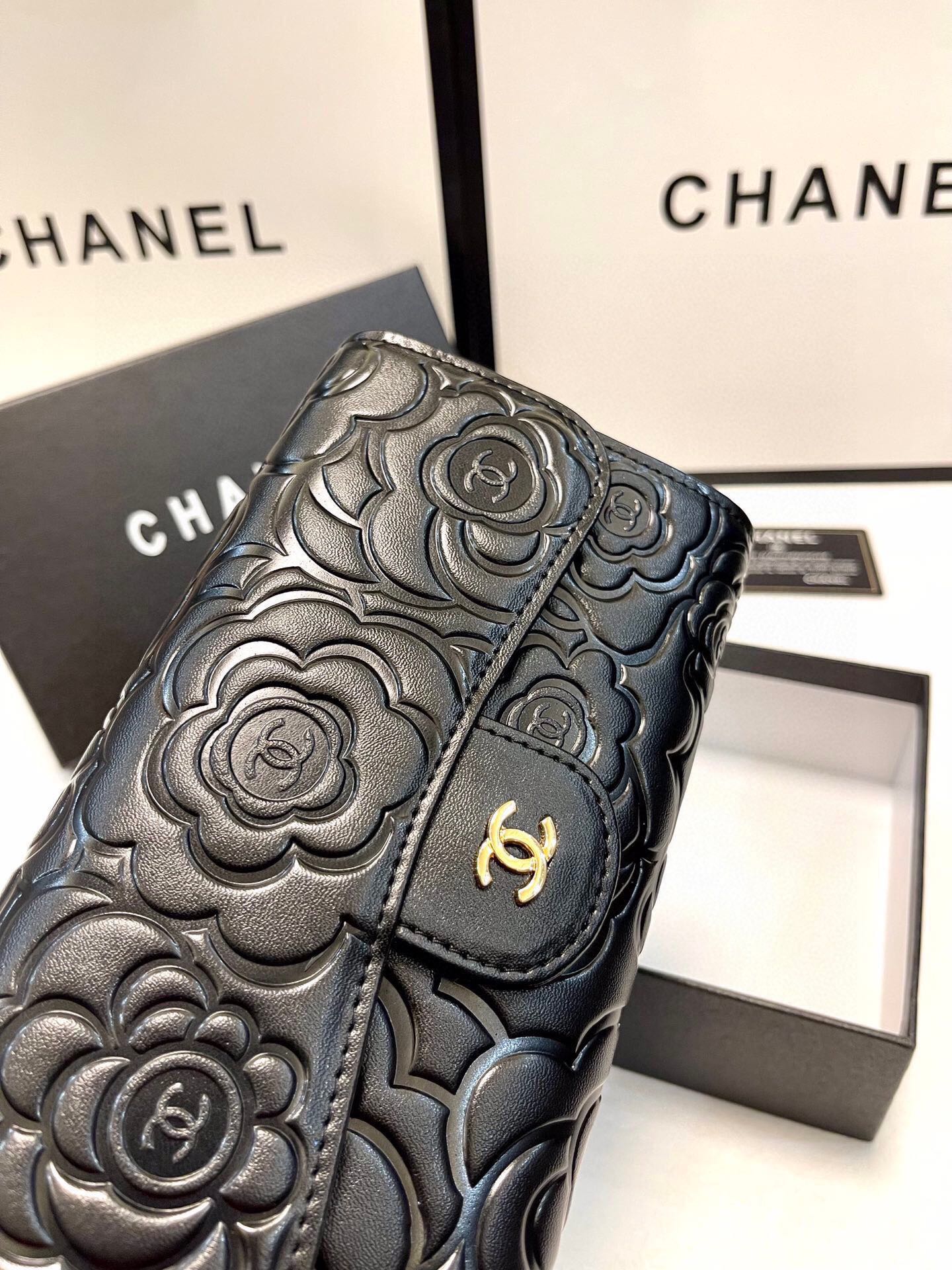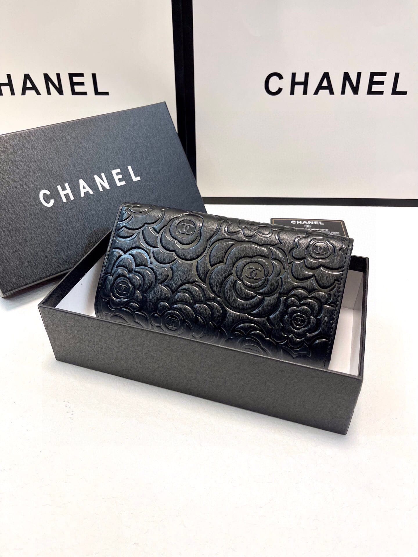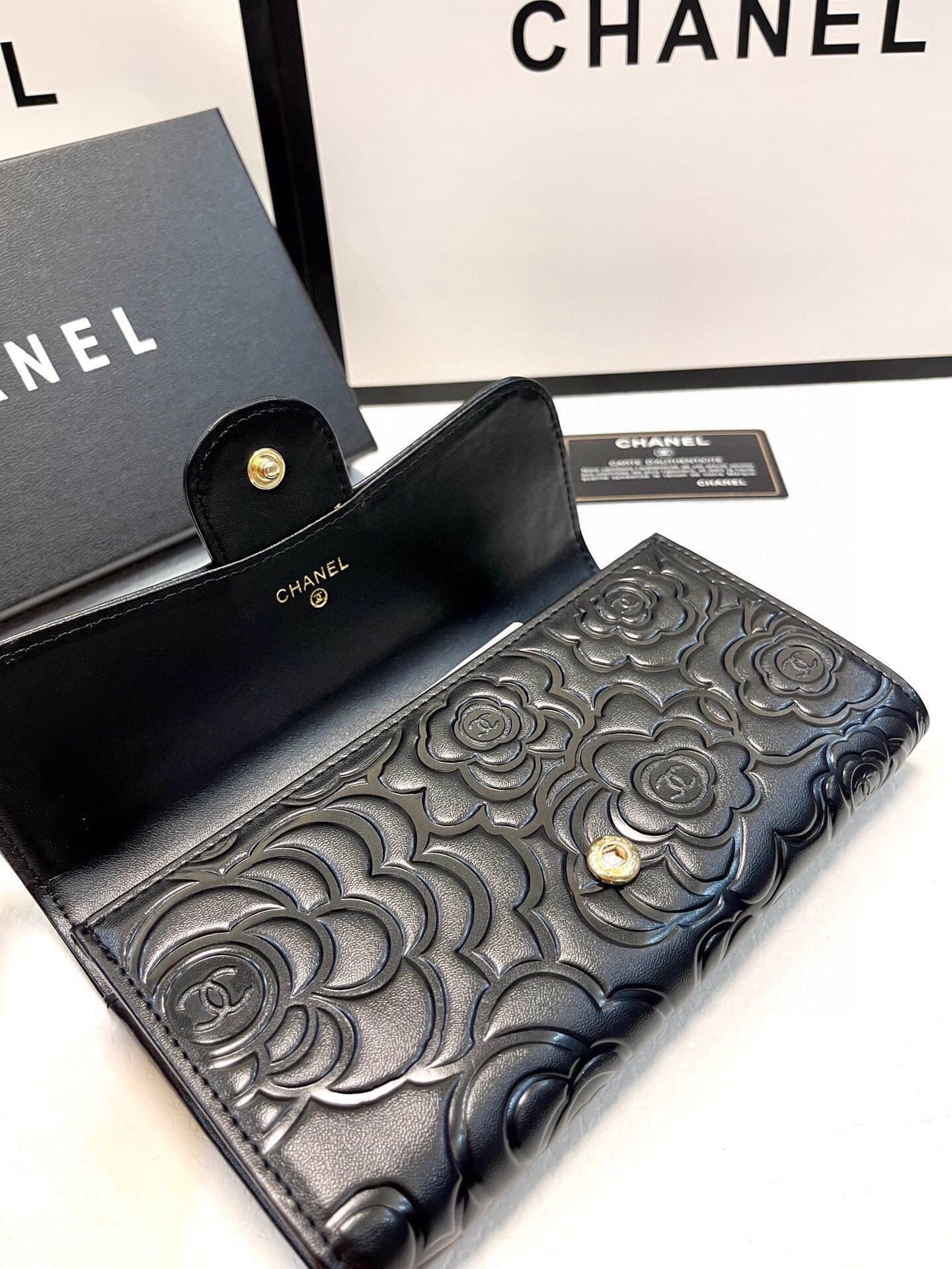 Chanel Camellia Embossed Flap Wallet / Black 19Cm