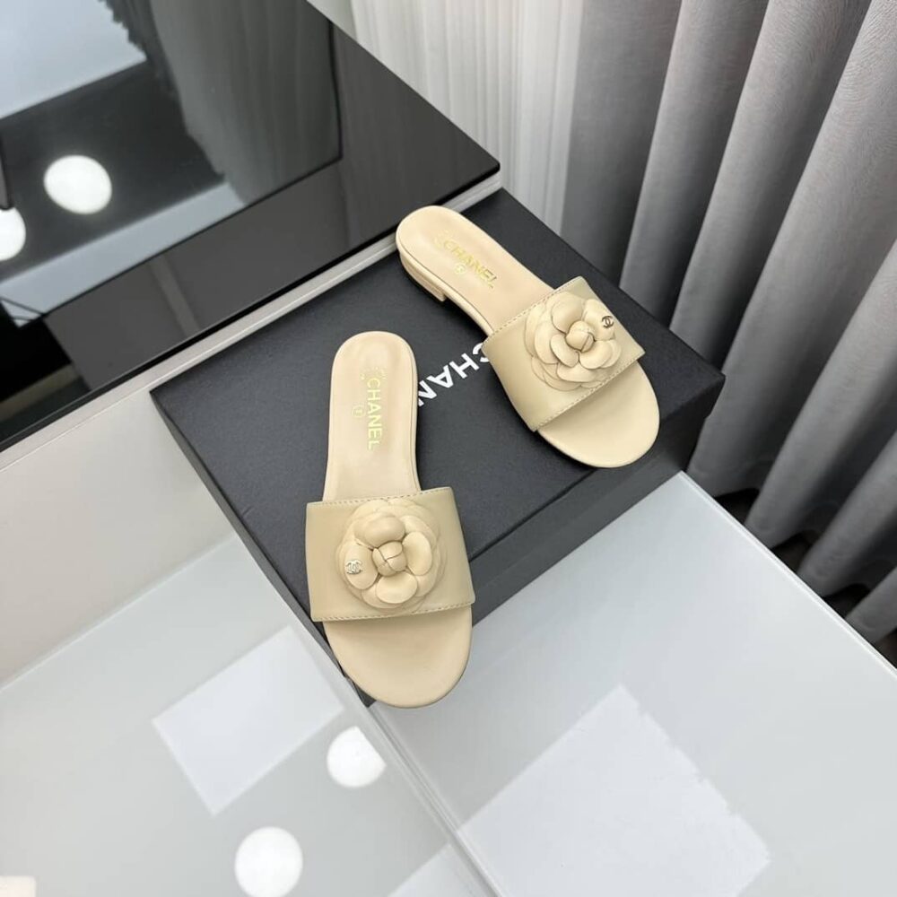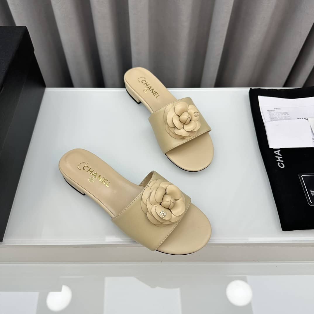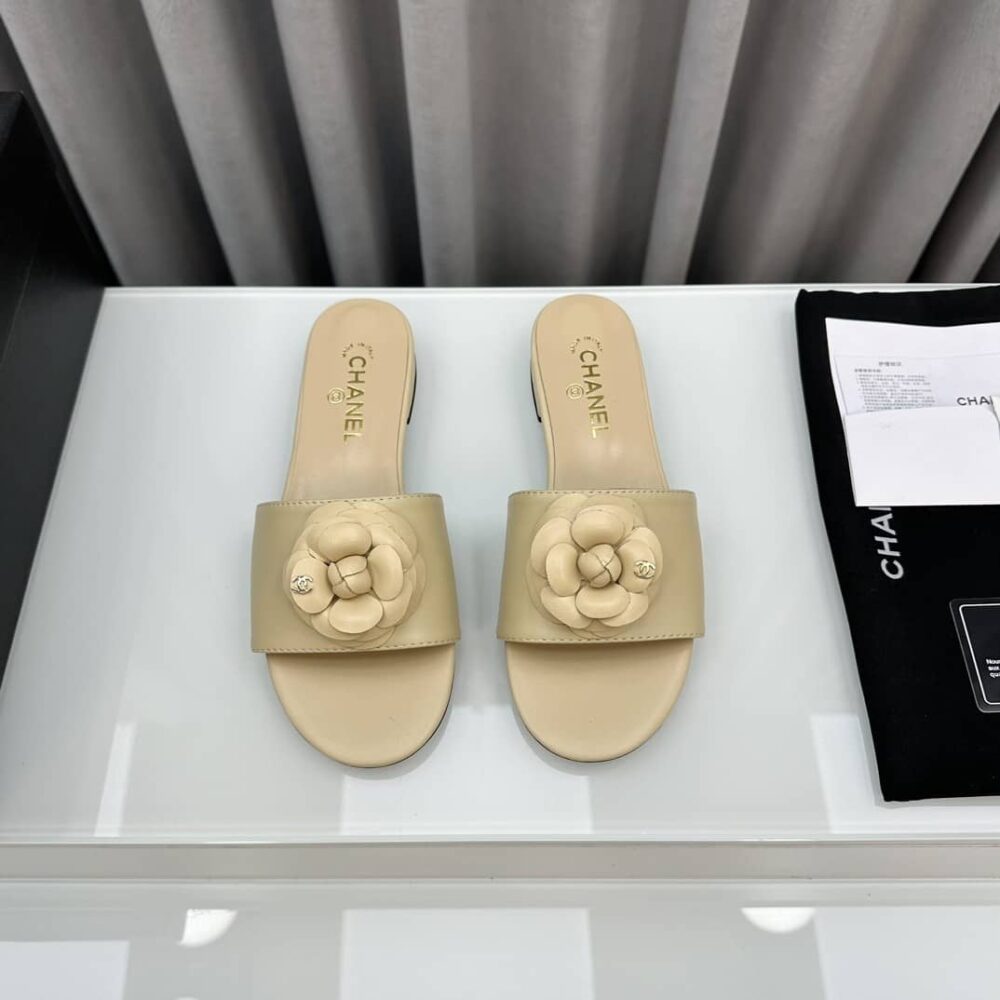 CHANEL CAMELLIA SLIDES BEIGE