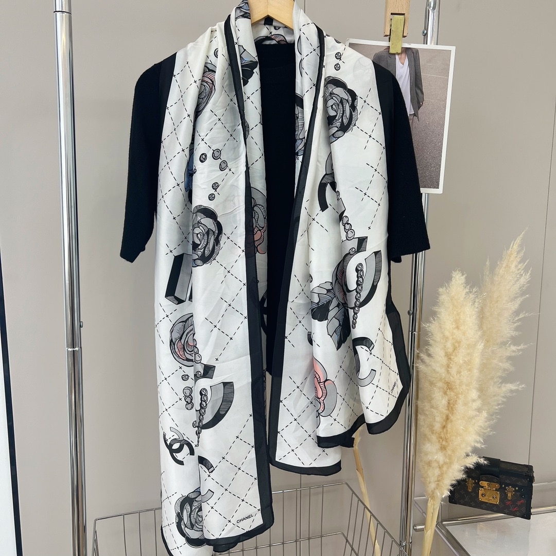 CHANEL CC WITH PINK FLOWER SQUARE SCARF WHITE 90CM