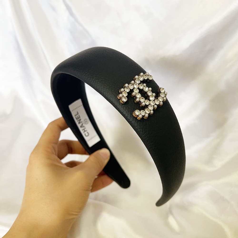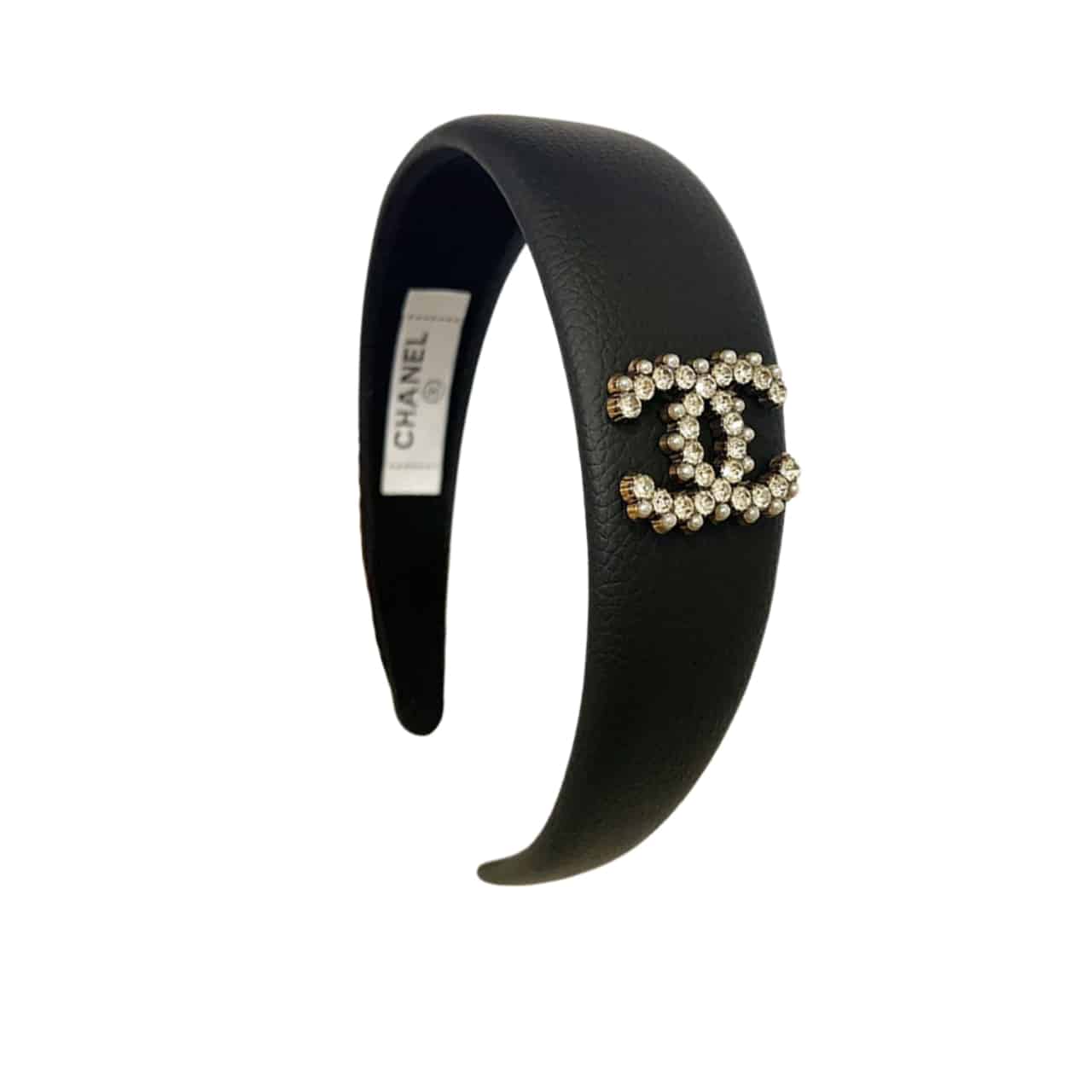 CHANEL CC LEATHER HEADBAND WITH GOLD HARDWARE IN BLACK