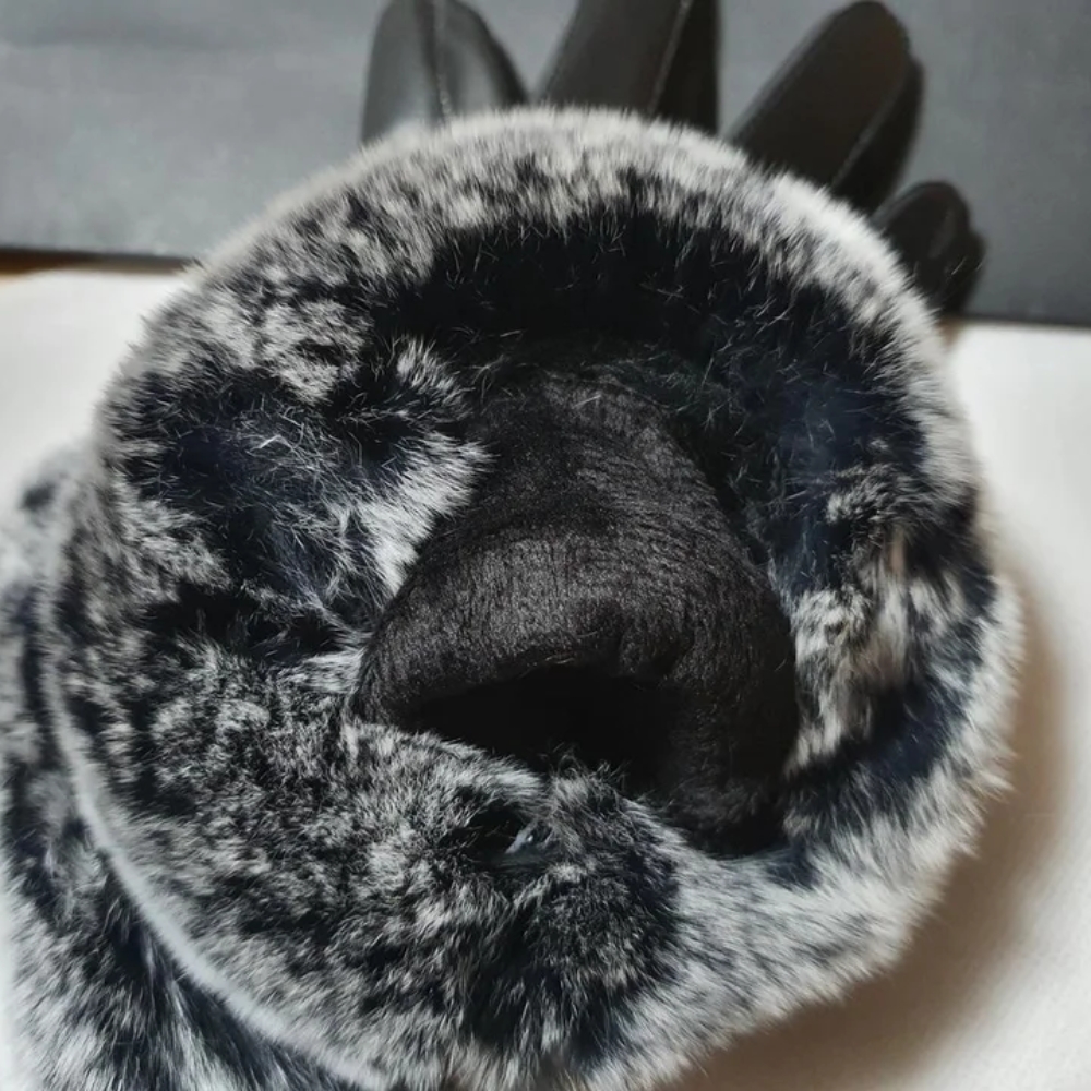 CHANEL CC LEATHER RABBIT FUR GLOVES BLACK AND GRAY