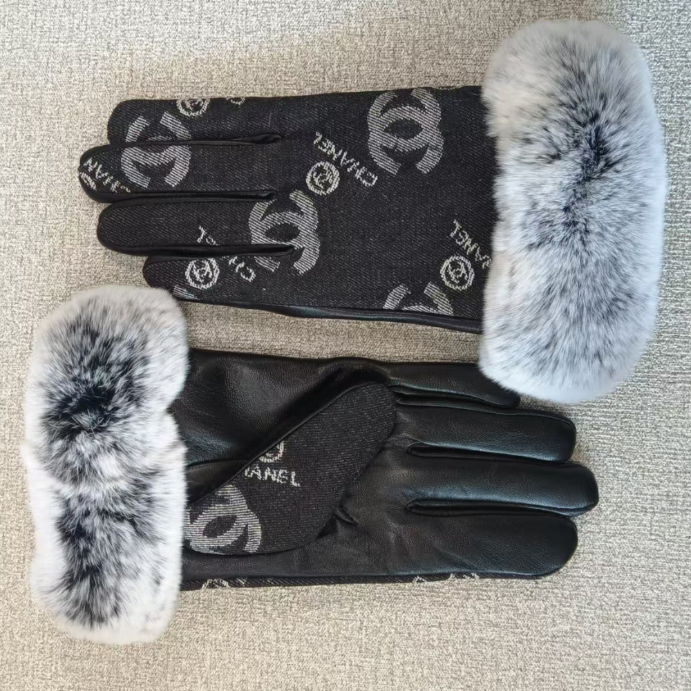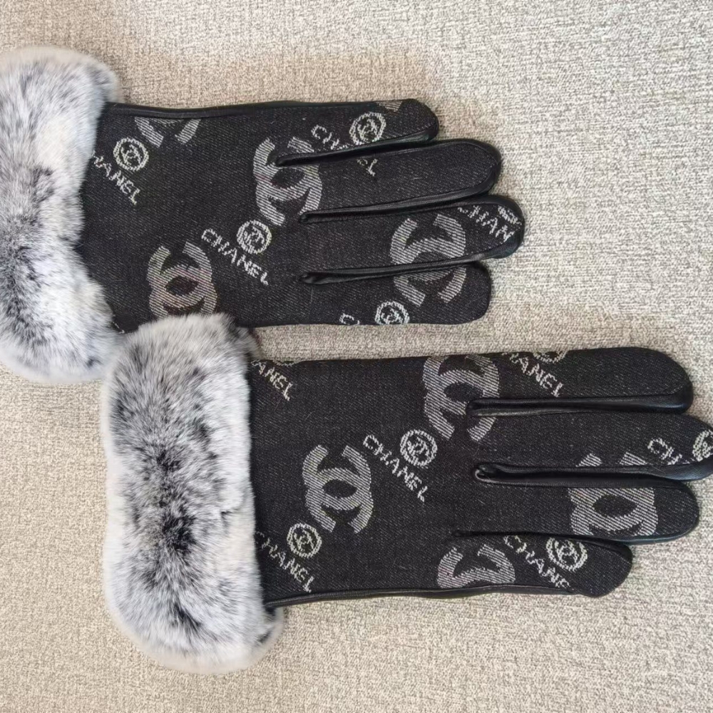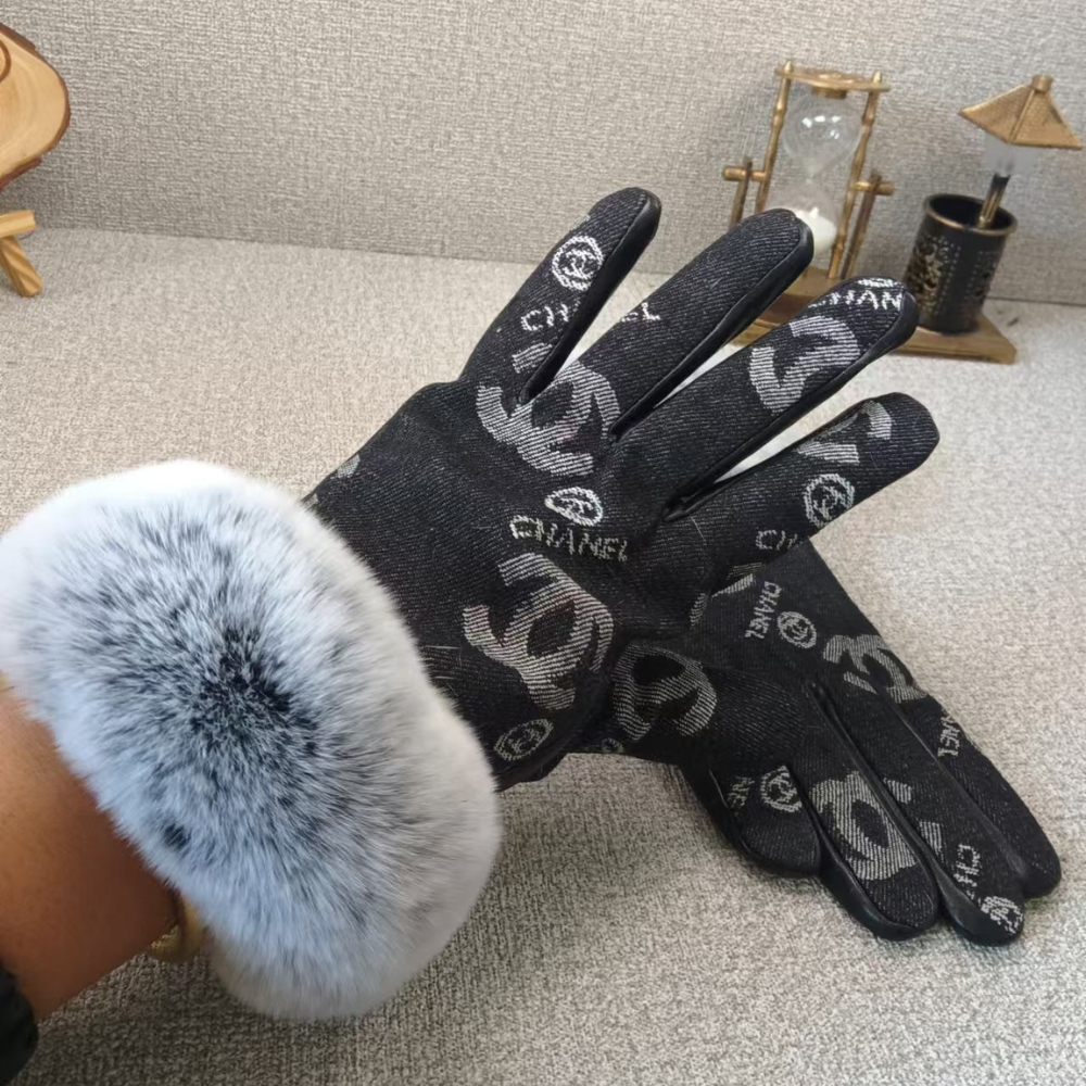 Chanel CC Logo Rabbit Fur Leather Fleece Gloves Denim Black