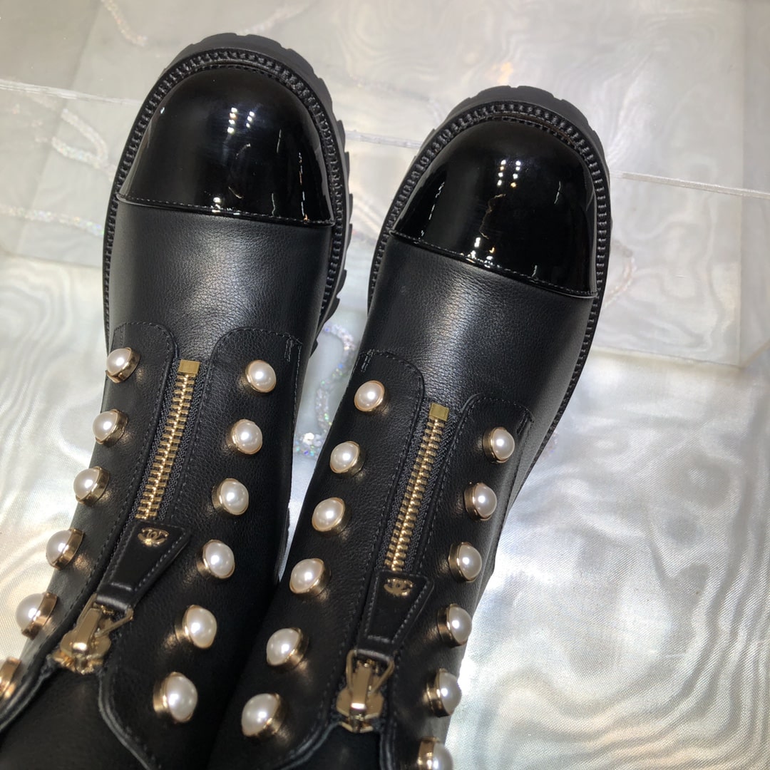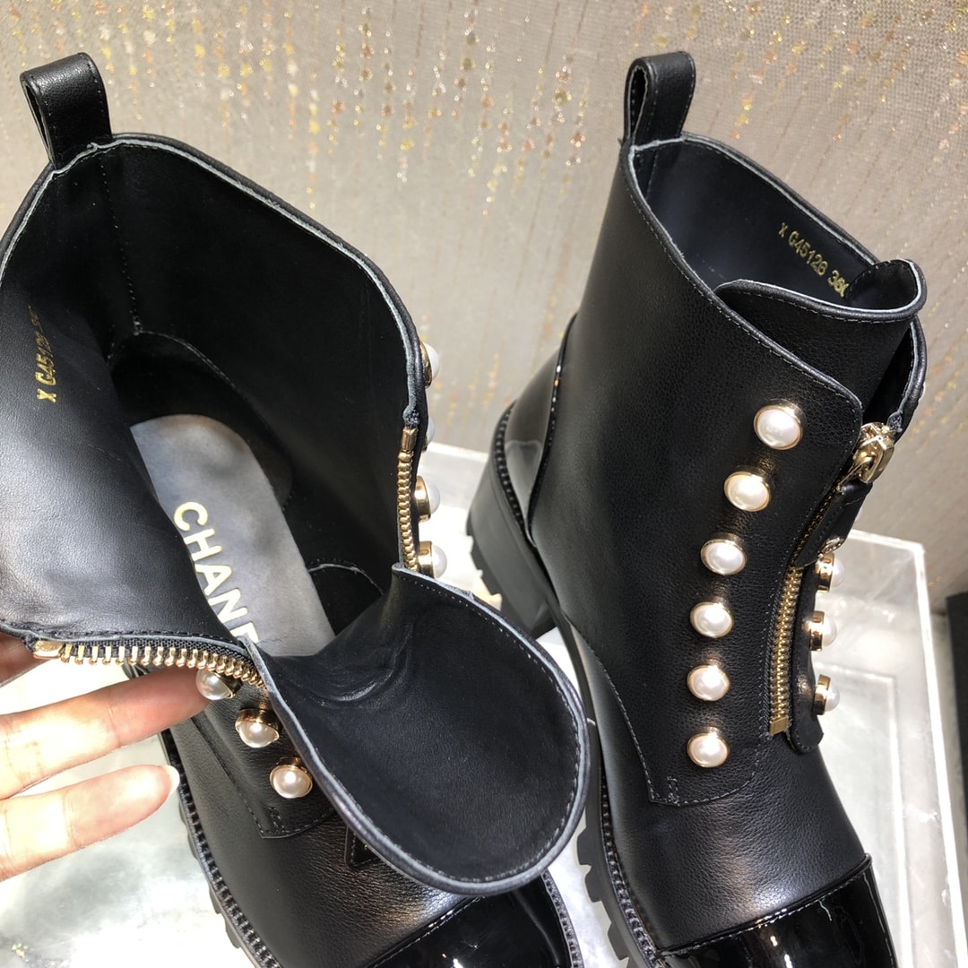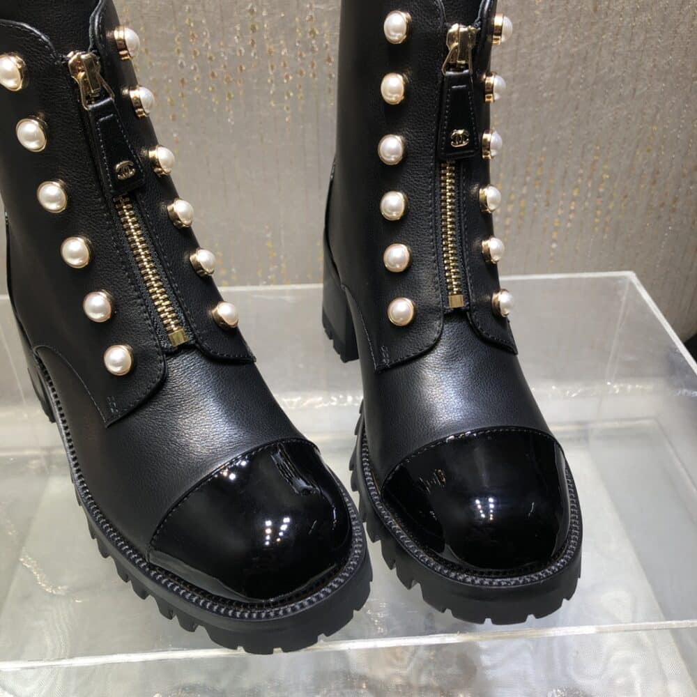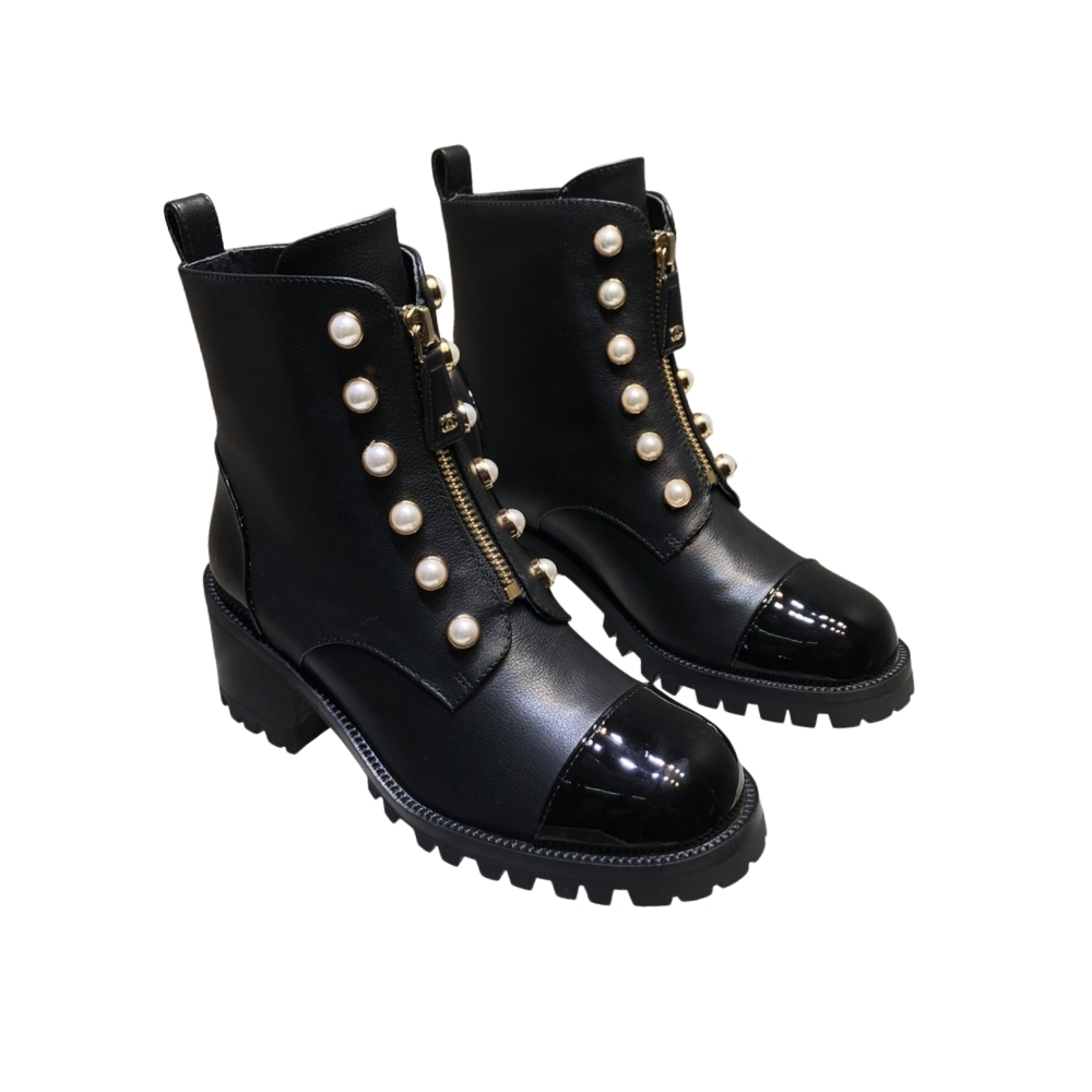CHANEL CC PEARL FRONT ZIPPER SHORT BOOTS BLACK