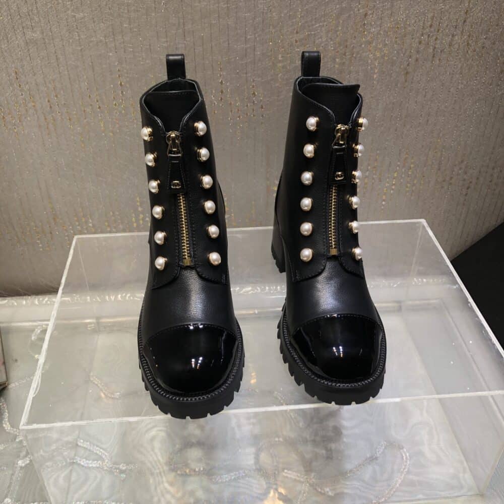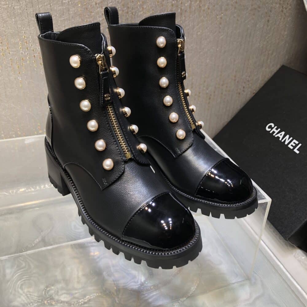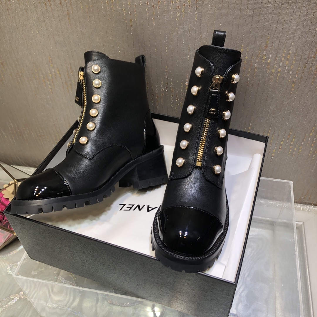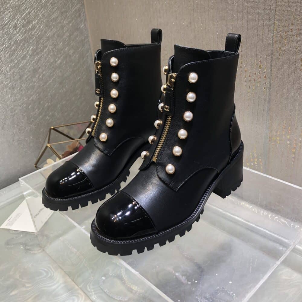CHANEL CC PEARL FRONT ZIPPER SHORT BOOTS BLACK