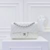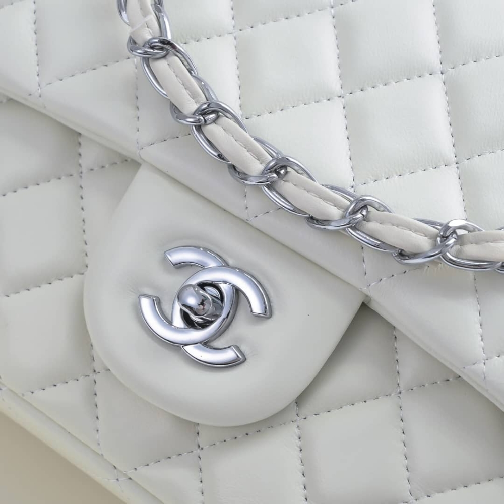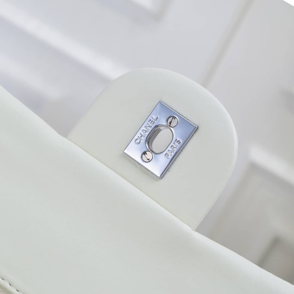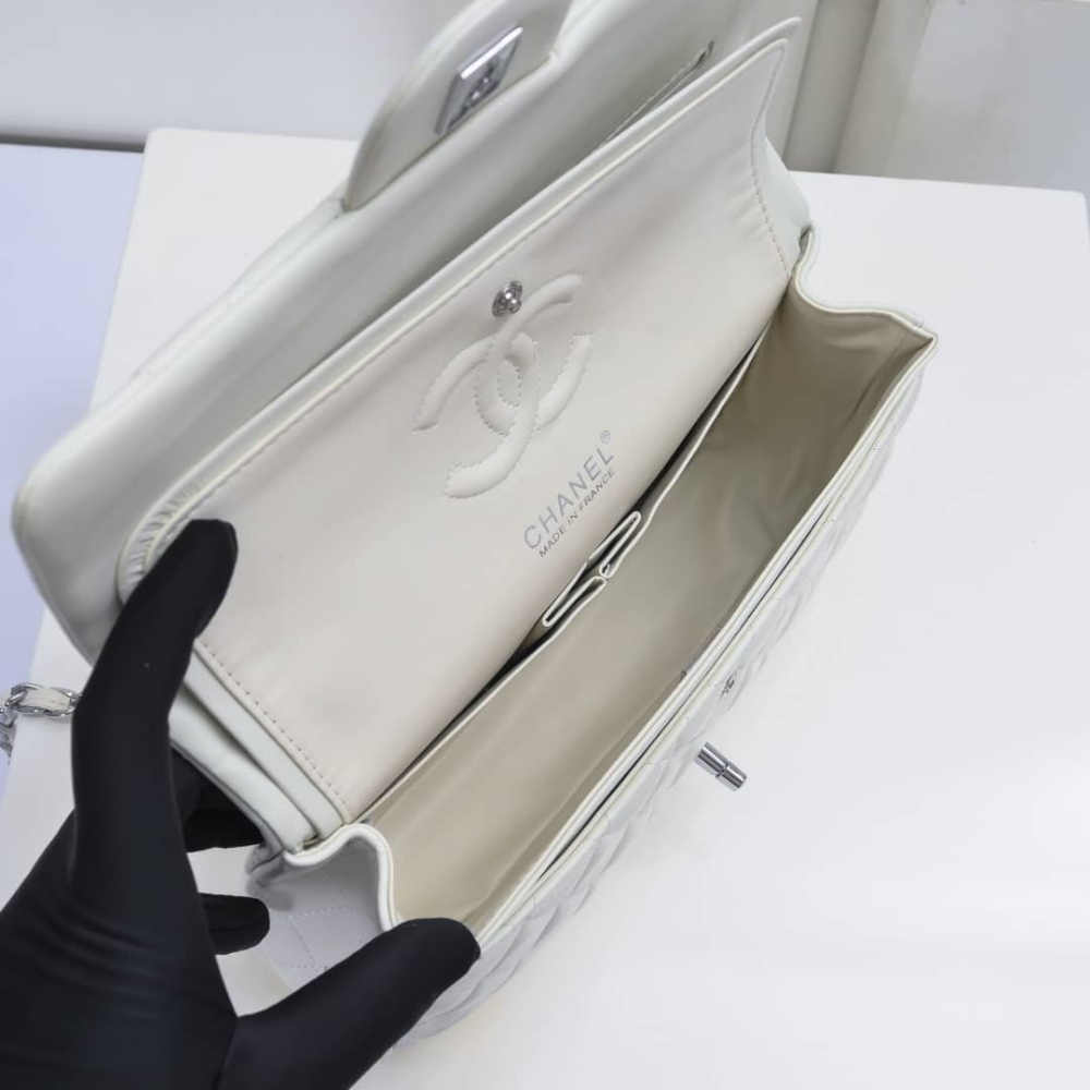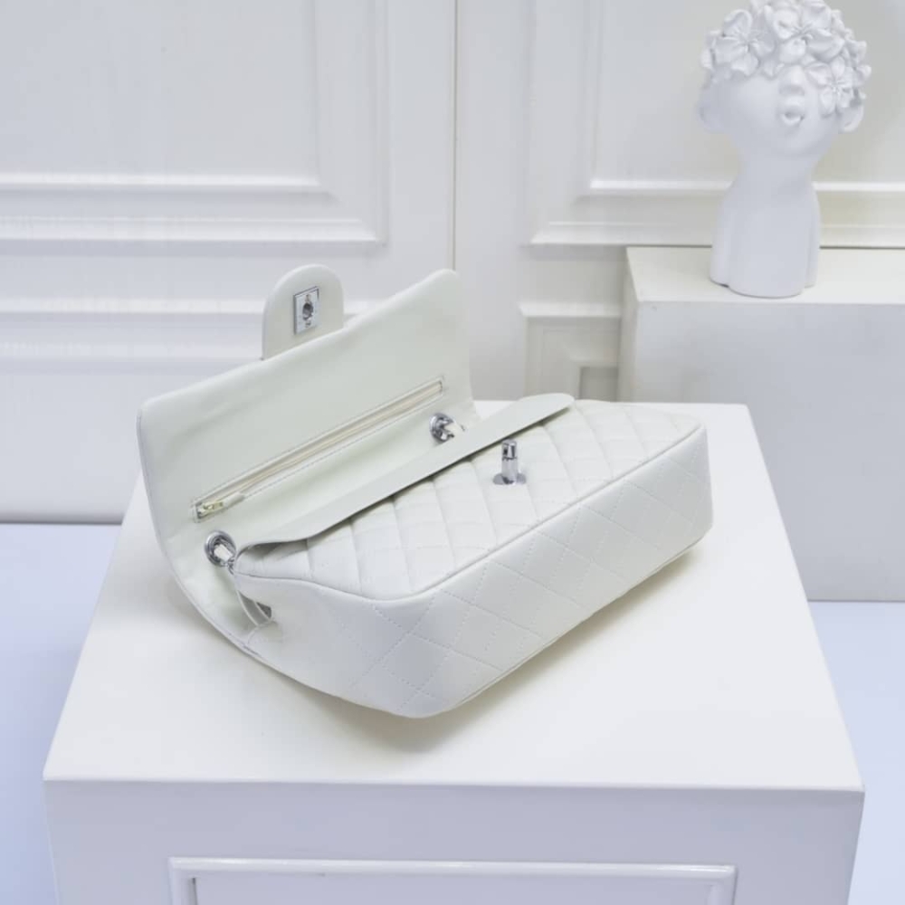 Chanel Classic Double Flap Bag White Silver Hardware features the iconic quilted silhouette crafted from luxurious leather, accented with elegant silver-tone hardware. Designed with the signature double-flap construction, it offers timeless sophistication and practical organization. A true classic that elevates both everyday and evening looks with effortless elegance.
