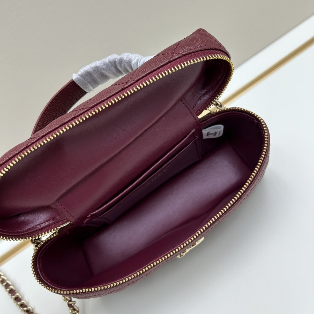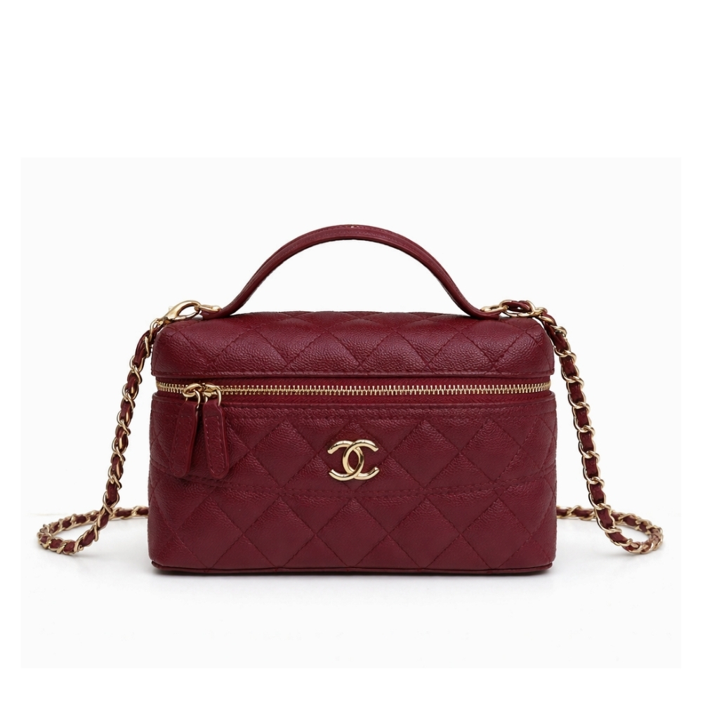 The features the signature diamond quilting and a structured vanity-case silhouette, accented with the iconic CC logo on the front. The design includes a top handle, a zip-around closure, and a chain shoulder strap for versatile carrying. With its compact 19cm size, this elegant piece is perfect for daily outings, travel, or adding a stylish touch to casual and chic looks.