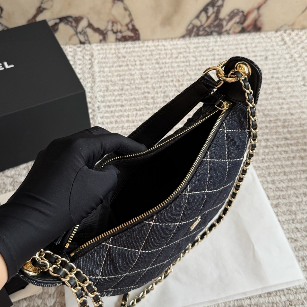 Chanel Clutch With Chain / Gold Tone Metal / Denim Dark Blue / 5.9 x 8.7 x 2.4 inches / Fits smartphone, and essential cosmetics / Daily Style for Women
