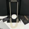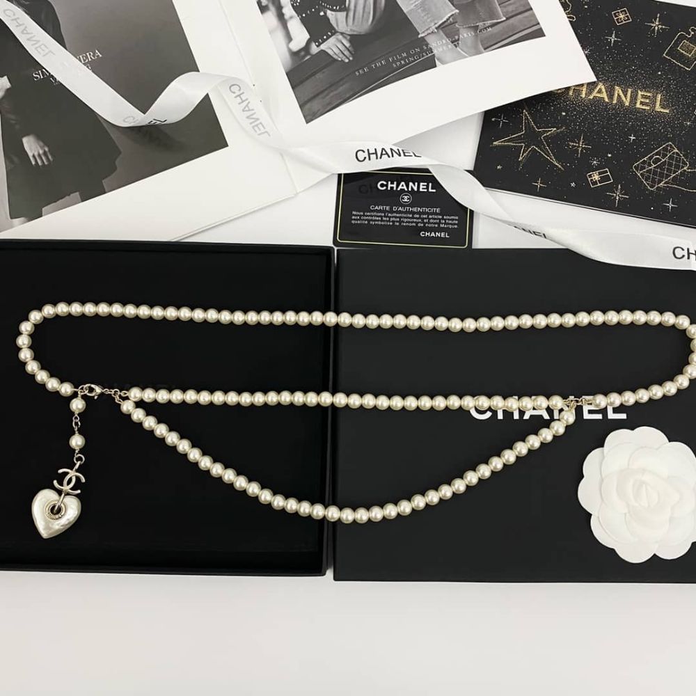 This exquisite double-strand pearl necklace by Chanel features lustrous pearls interspersed with a heart-shaped charm and the iconic “CC” logo. The piece is completed with a delicate gold-tone chain and a dangling pearl, making it a timeless and elegant accessory that perfectly complements any outfit. The luxurious presentation is enhanced by the accompanying Chanel authenticity card and stylish box, making it a perfect gift for those who appreciate sophistication and classic beauty.