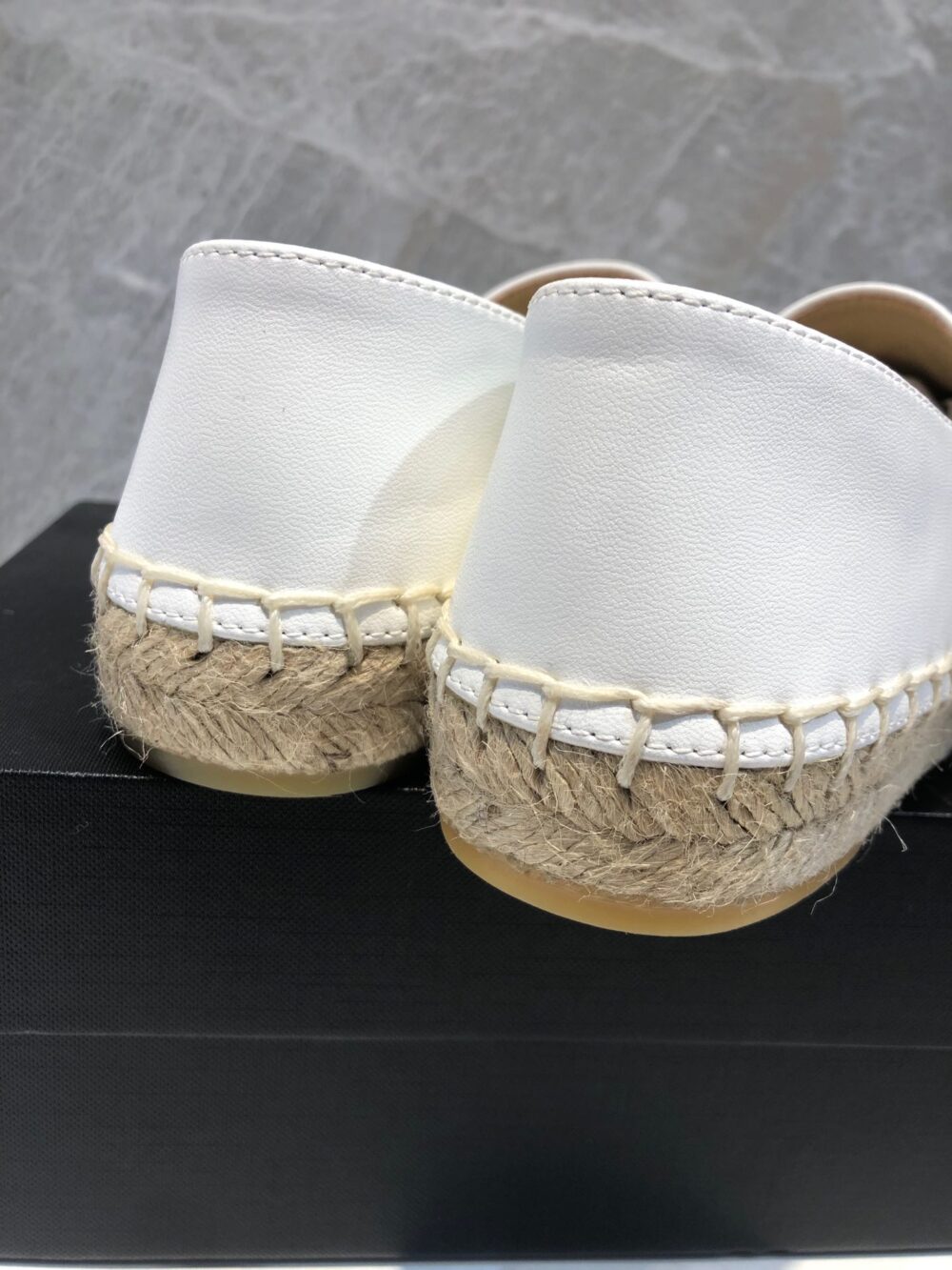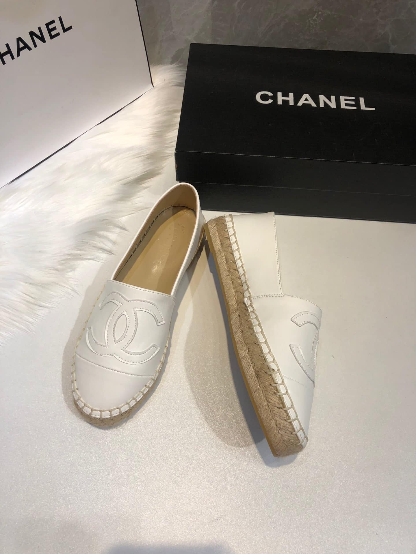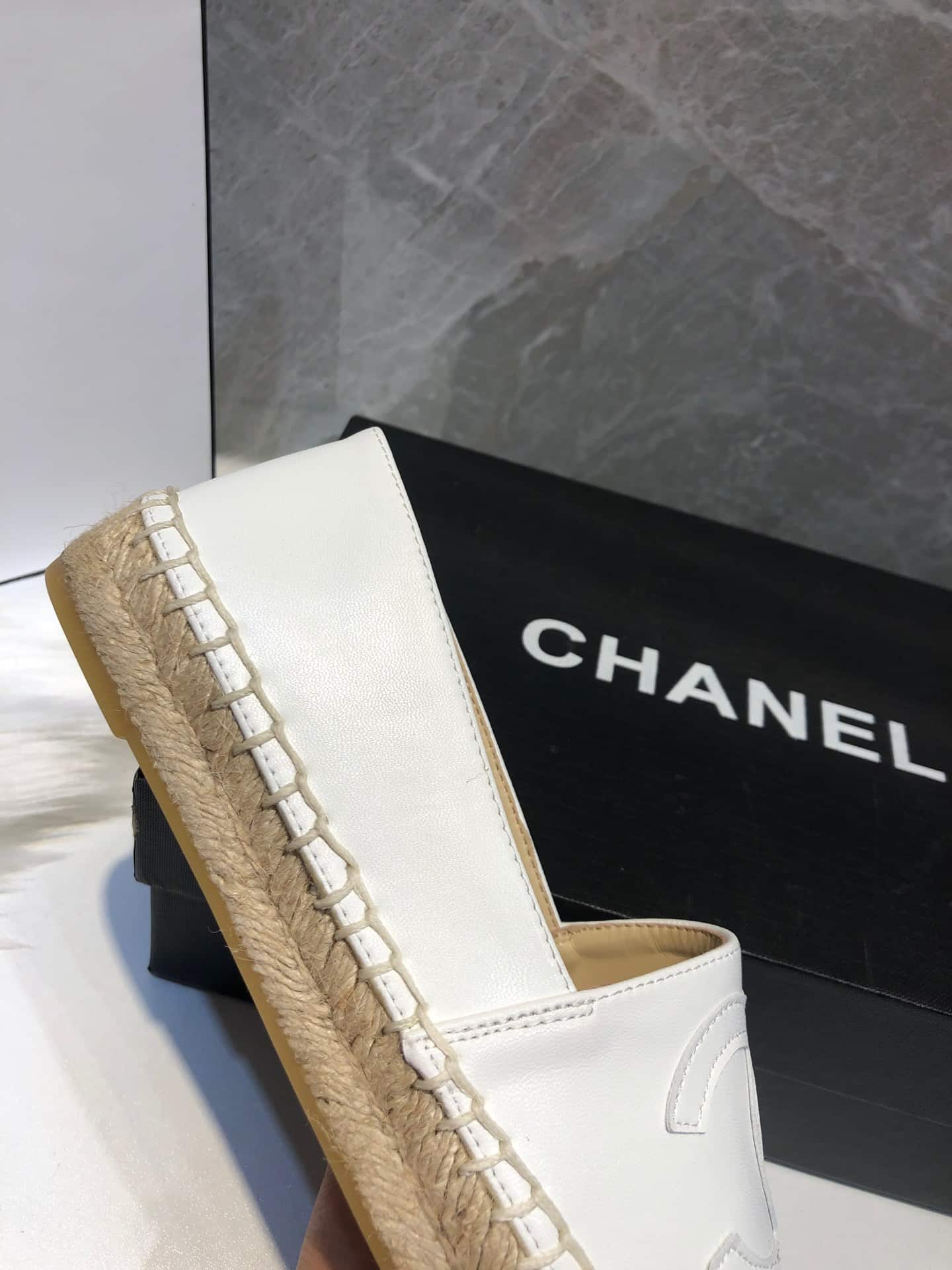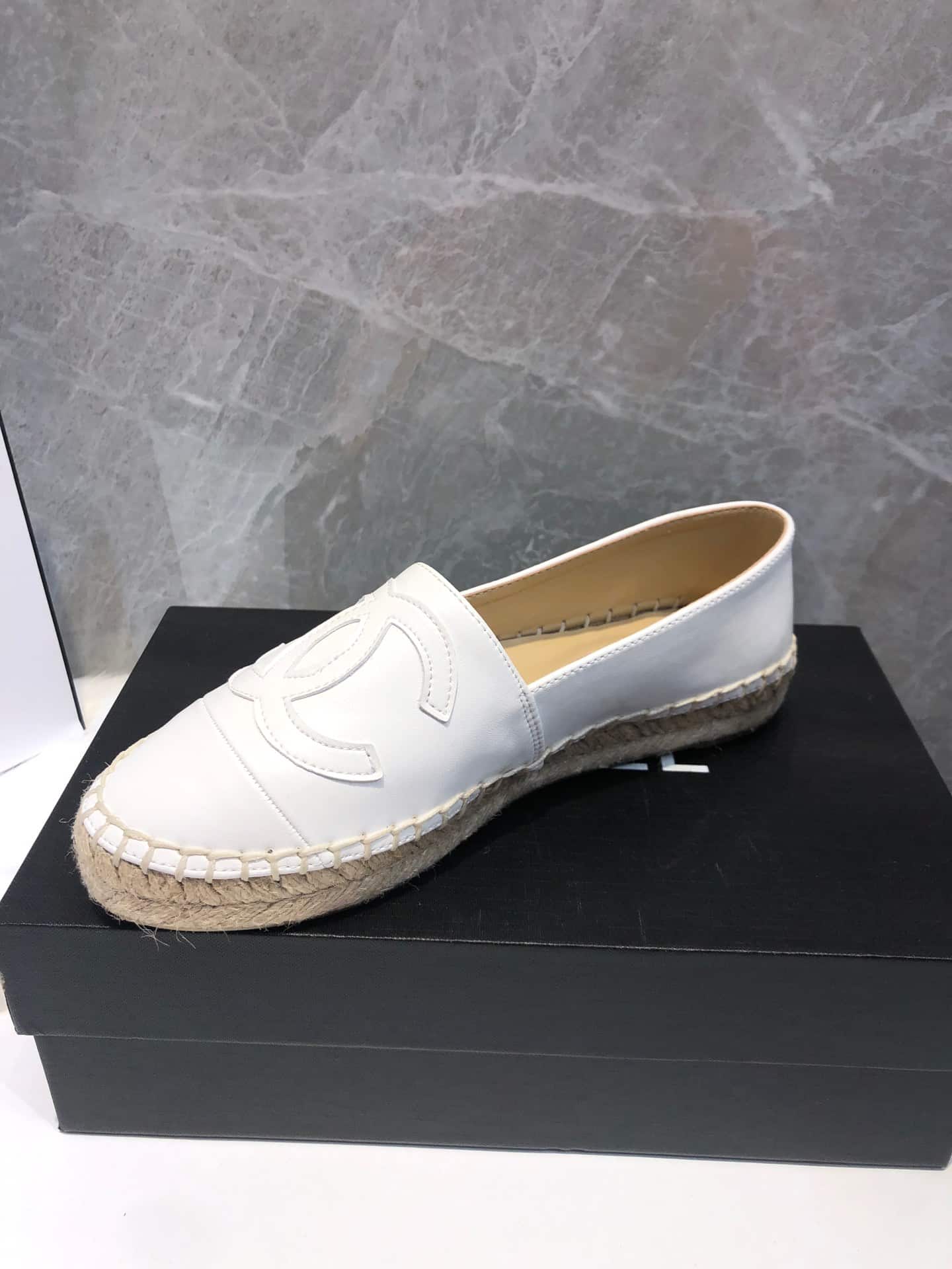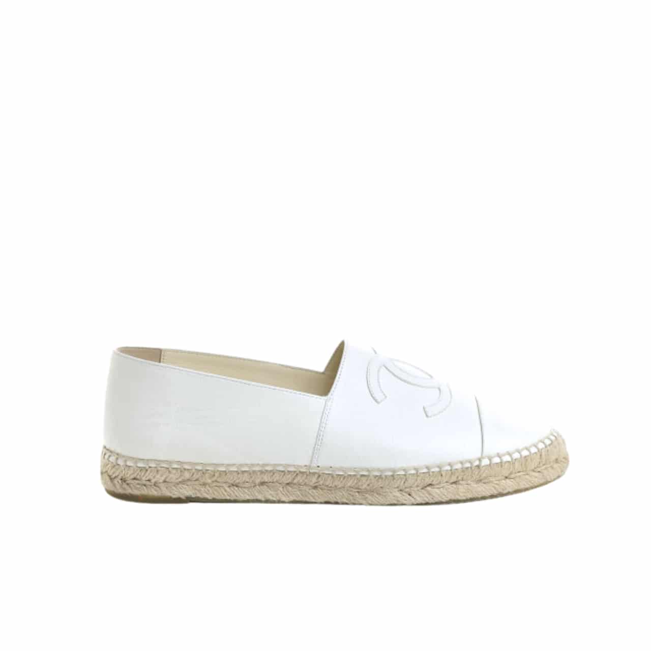 CHANEL EMBROIDERED ESPADRILLE LEATHER CAP TOE FLATS WHITE