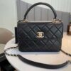 This Chanel top handle bag is beautifully crafted in black, showcasing the house’s timeless elegance. The gold-tone CC logo clasp adds a touch of sophistication, while the versatile leather-interwoven chain strap allows for both shoulder and crossbody wear. Compact yet chic, it’s the perfect accessory to elevate any outfit with understated luxury.