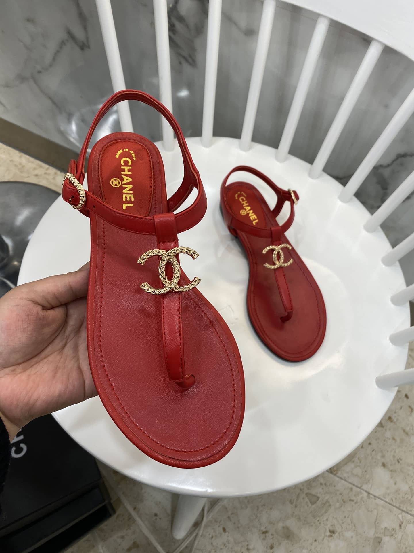 CHANEL GOLD CC LOGO THONG SANDALS WINE RED