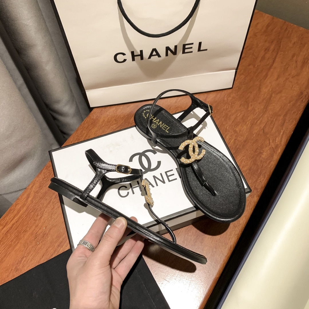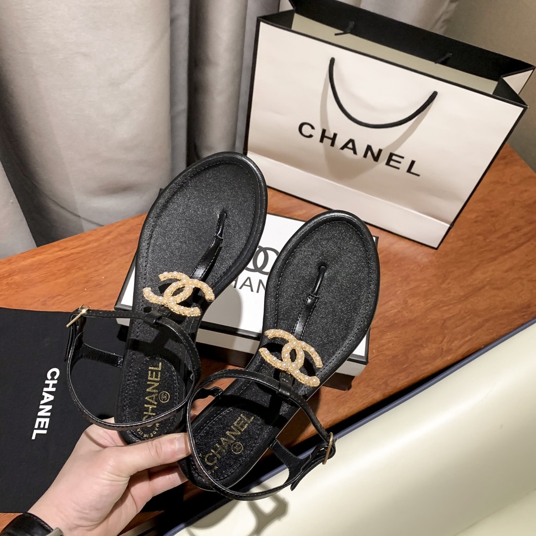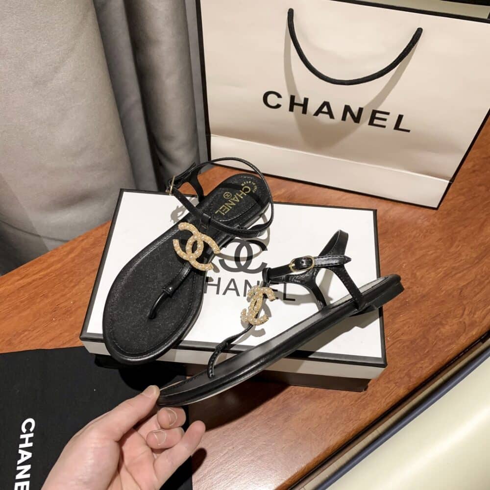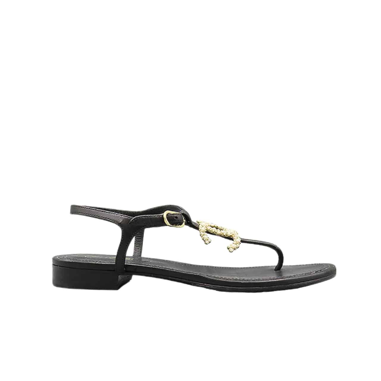 CHANEL GOLD PEARL CC LOGO THONG SANDALS BLACK