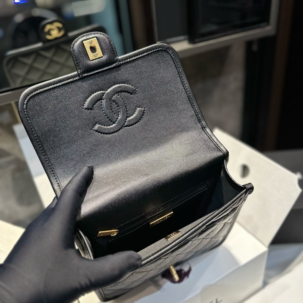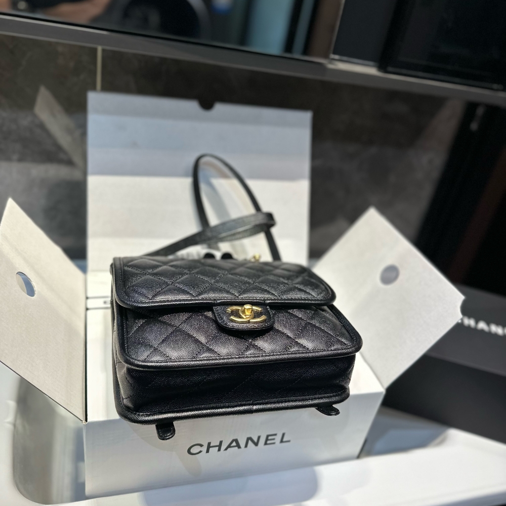 Chanel Grained Shiny And Gold Tone Metal Backpack Black / 8.7 × 7.9 inches / Gold-tone hardware / Fit Daily Essentials / Daily Bags