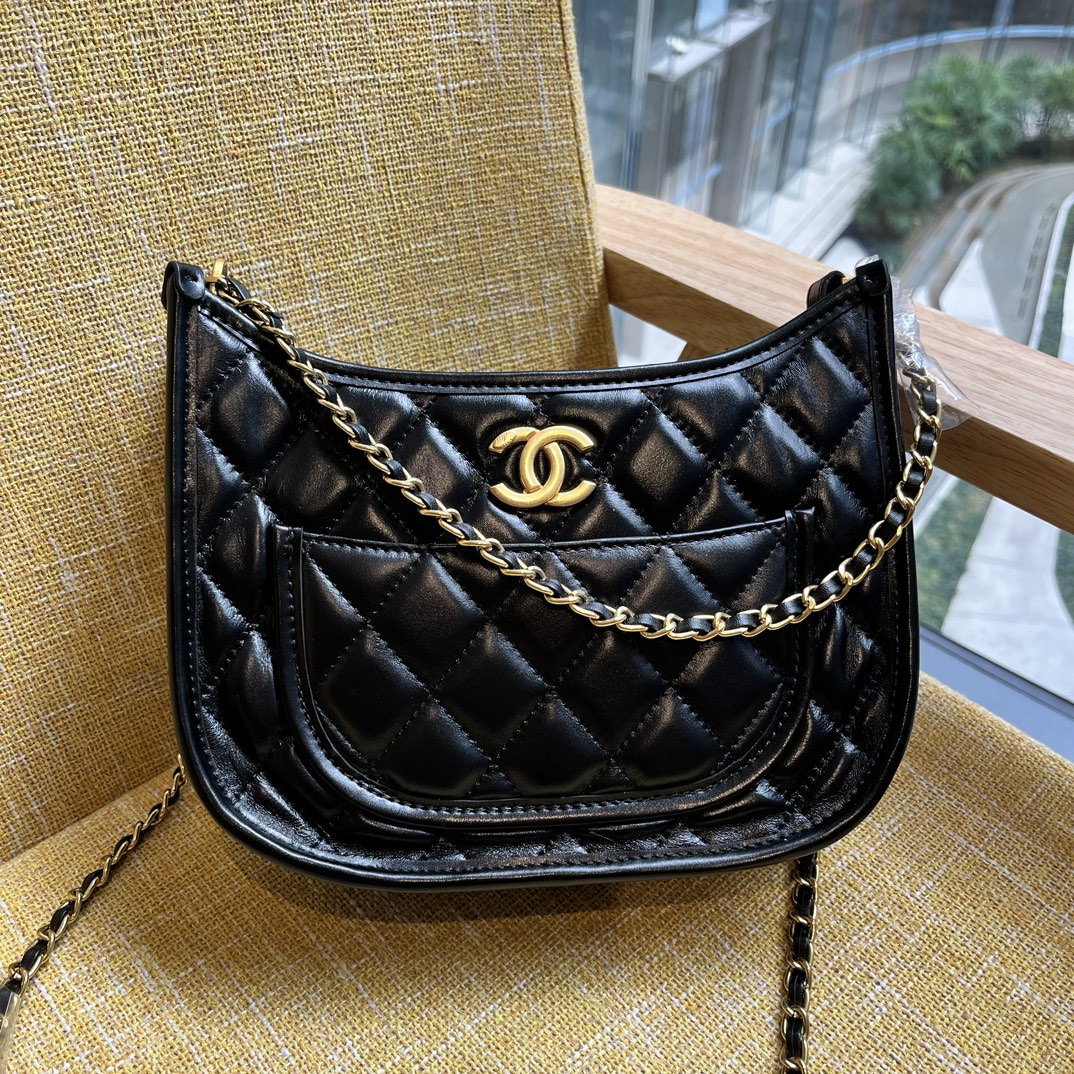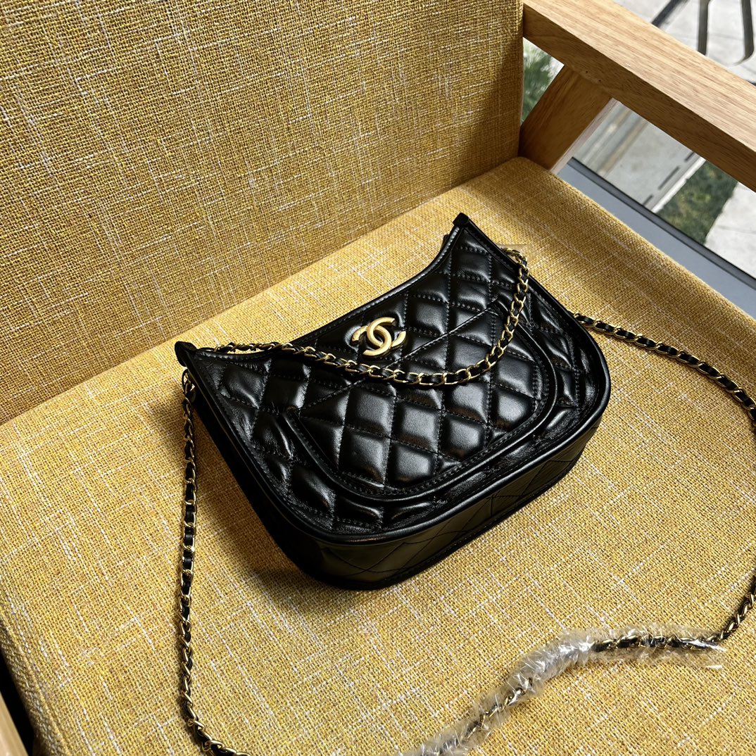 CHANEL HOBO HANDBAG GOLD TONE METAL BLACK 23CM AS4666