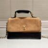 This Chanel Top Handle Flap Bag is in brown suede and black shiny with brushed gold hardware, featuring featuring suede leather with a quilted shiny leather base, front flap CC turnlock closure, a leather top handle, and a single Interwoven brushed gold tone and black leather shoulder strap.