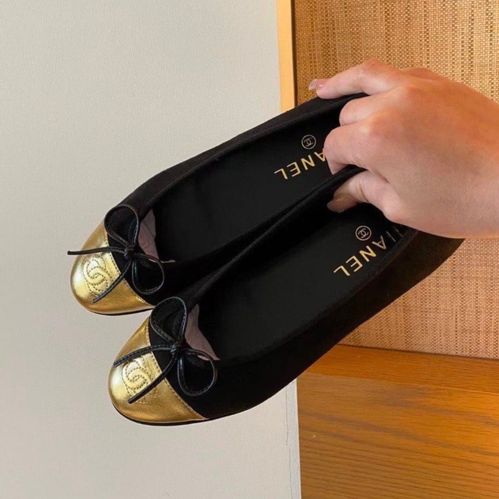 CHANEL LEATHER CAP TOE BALLET FLATS BLACK GOLD