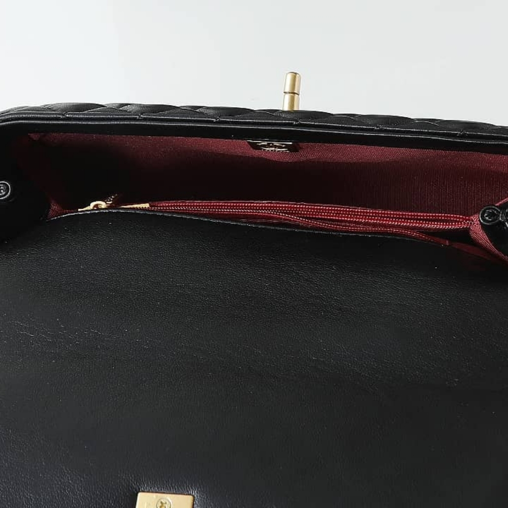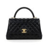 The Chanel Medium Coco Handle Bag in black featuring a structured trapezoidal shape. It is designed with a sturdy rolled top handle and a detachable interlaced chain-and-leather strap, allowing for elegant hand, shoulder, or crossbody carry. Finished with the timeless gold-tone CC turn-lock and a well-organized interior, this bag remains a highly coveted piece that perfectly balances classic heritage with modern functionality.