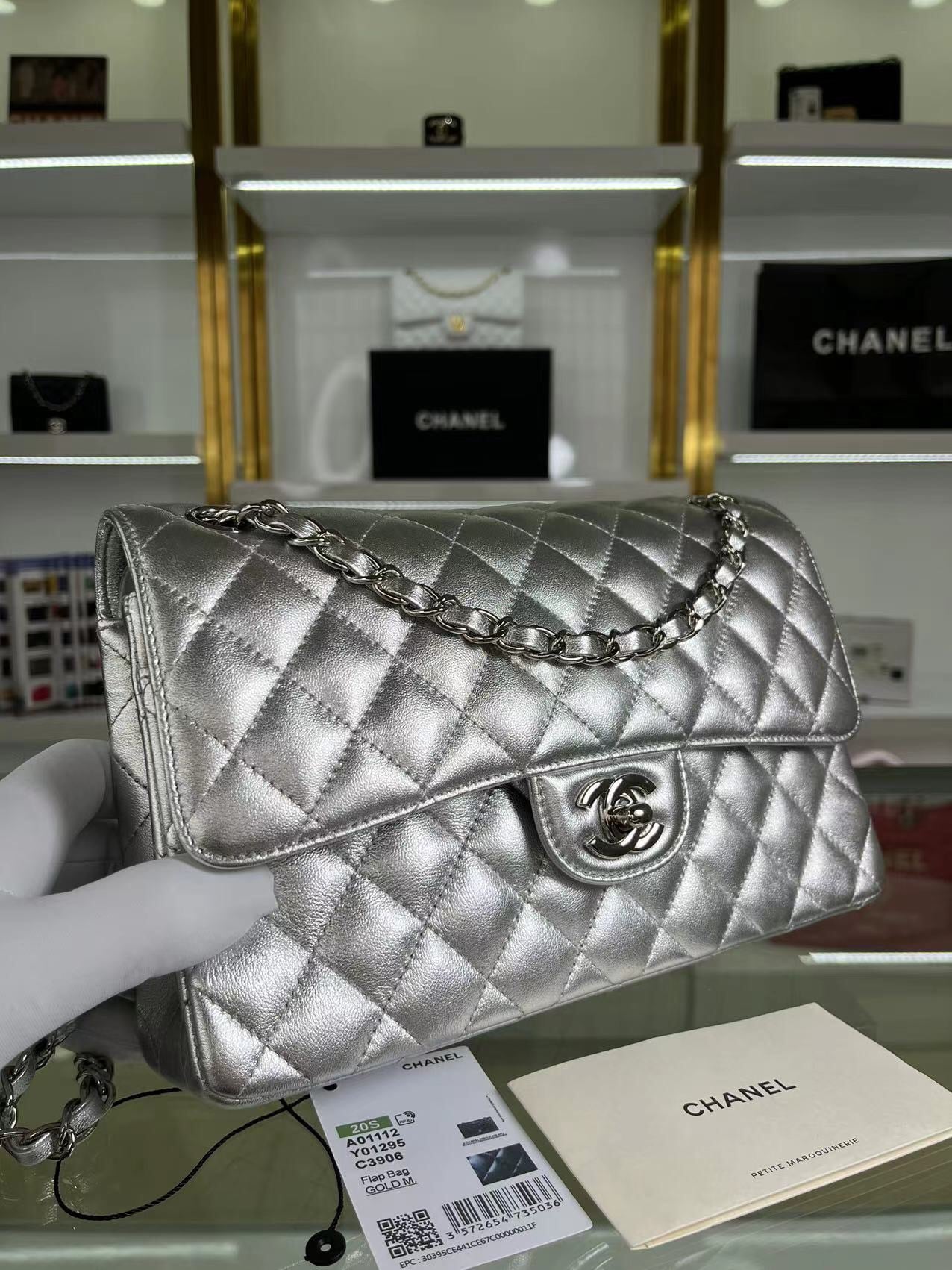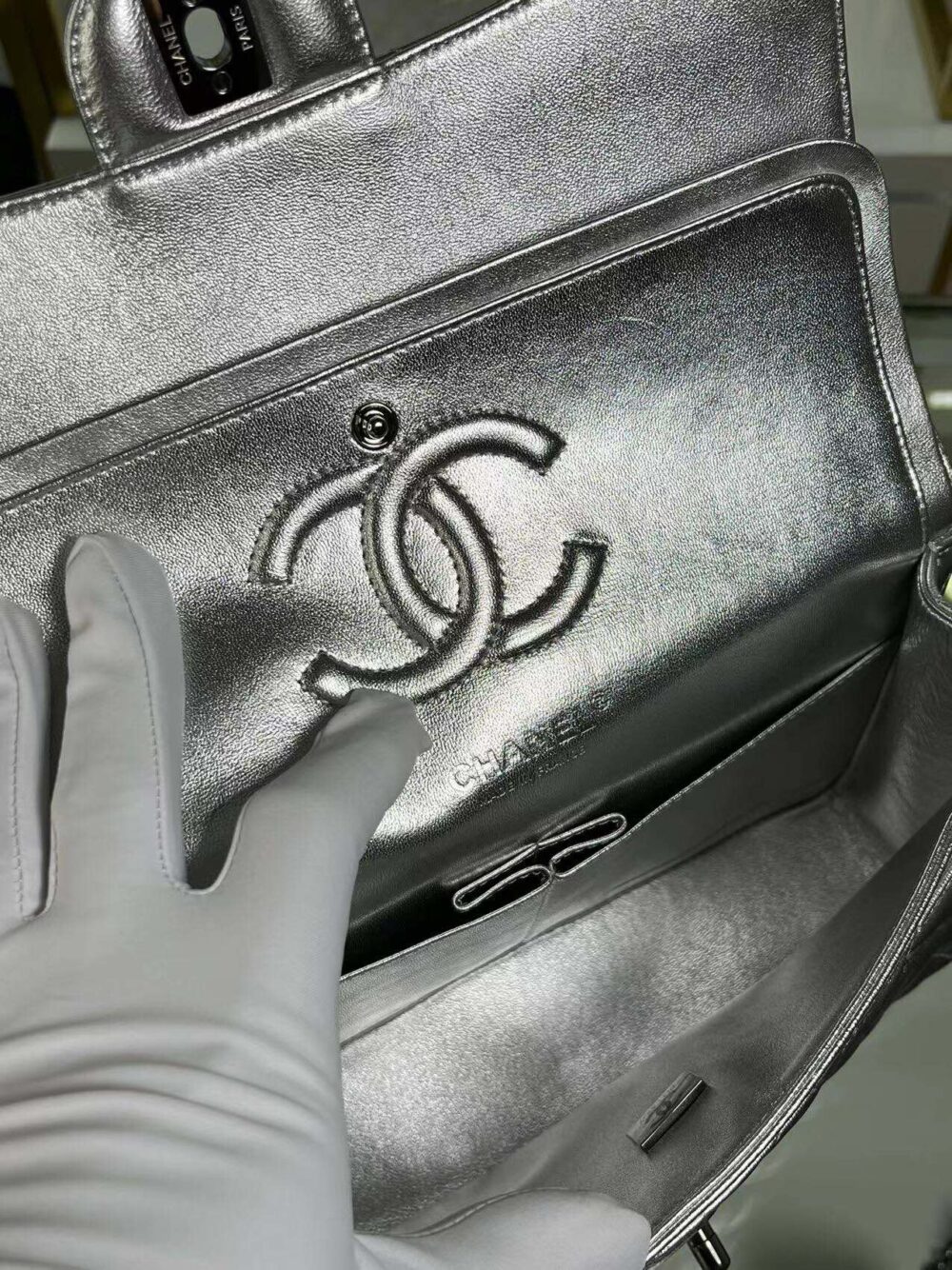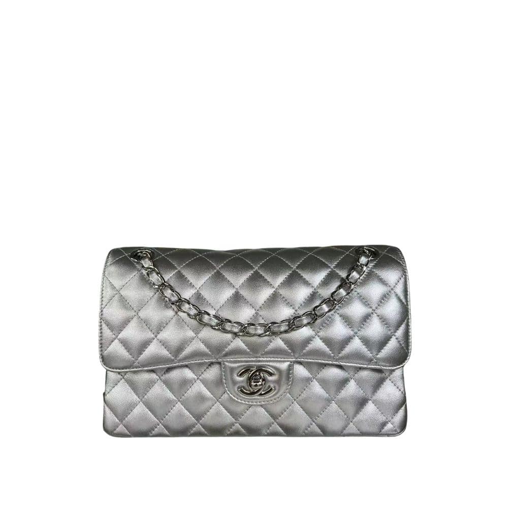 CHANEL MEDIUM DOUBLE FLAP BAG SILVER 26CM