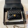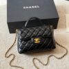 The Chanel Mini Flap Bag with Top Handle crafted from black leather with iconic quilting. It features a refined rigid top handle and the signature gold-tone metal interlaced chain strap, allowing for versatile hand or crossbody carry. The design is completed with the timeless CC turn-lock closure and a practical rear slip pocket, making it an elegant and functional staple for any collection.