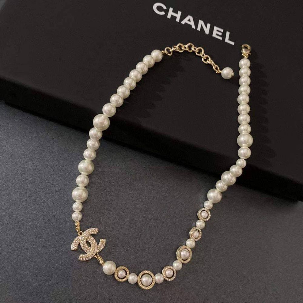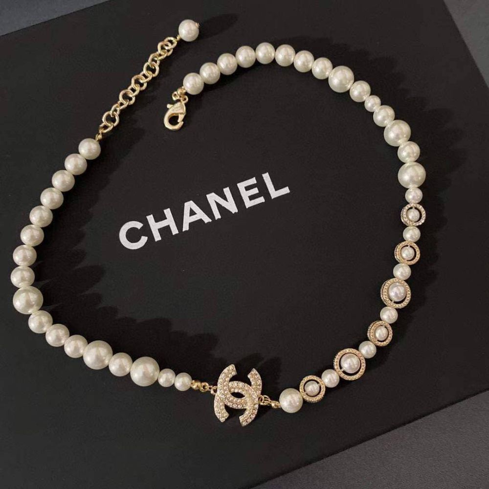 Chanel Pearl Symphony Necklace is a timeless piece featuring glossy white pearls, gold-tone details, and sparkling crystal accents. Perfect for adding a classy, elegant touch to any outfit.