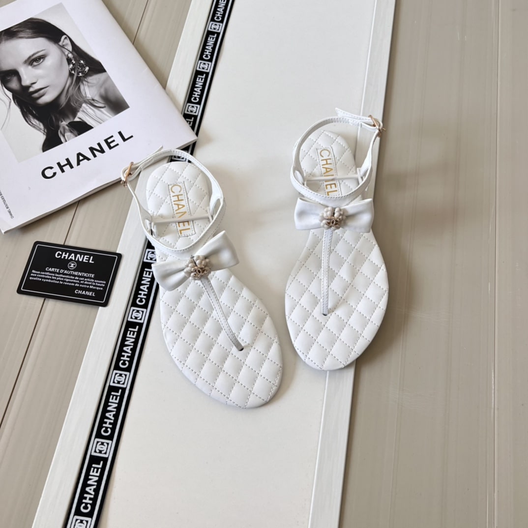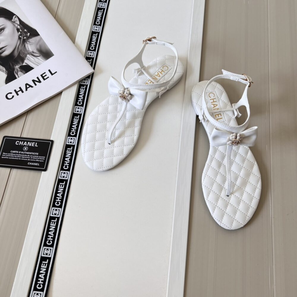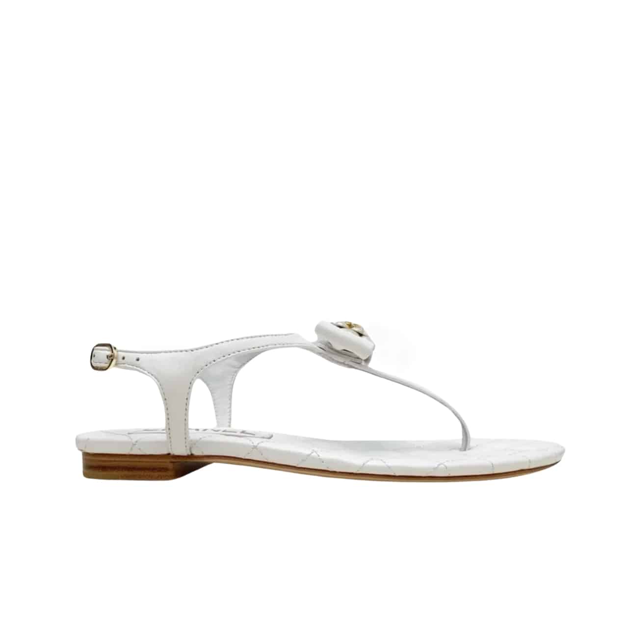 CHANEL WHITE QUILTED LEATHER WITH WHITE CAMELLIA CC LOGO BOW THONG SANDALS