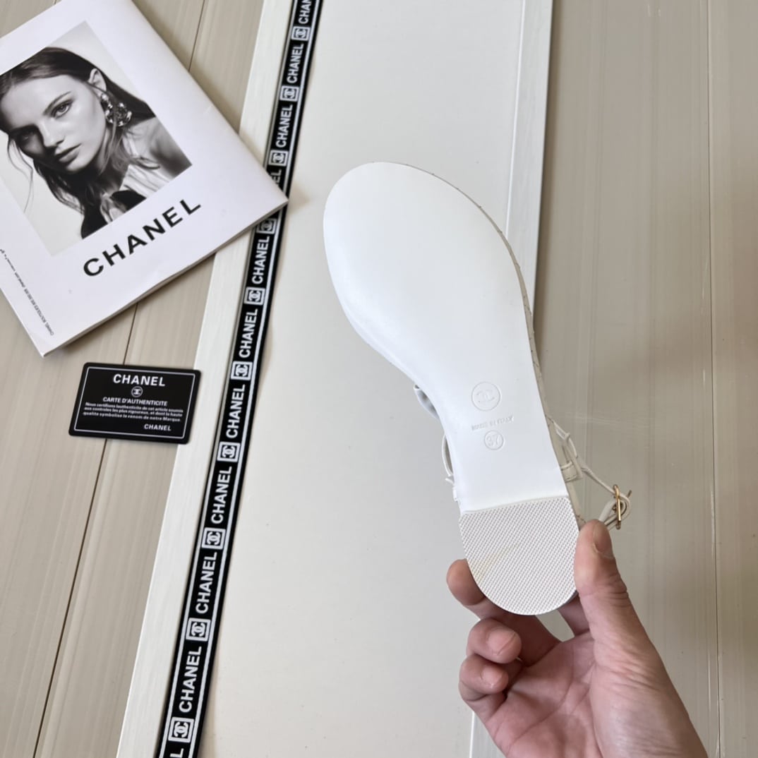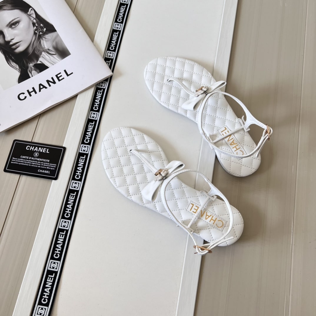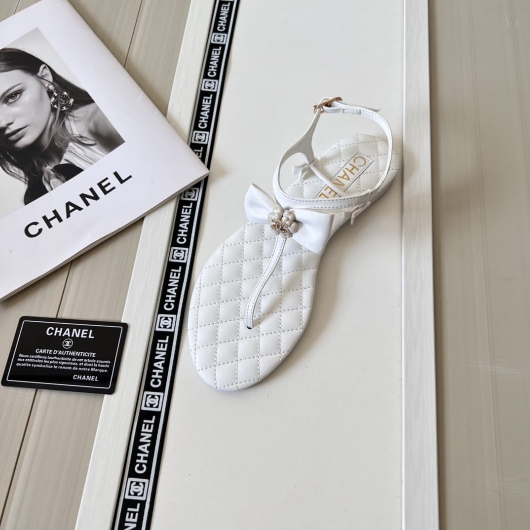 CHANEL WHITE QUILTED LEATHER WITH WHITE CAMELLIA CC LOGO BOW THONG SANDALS