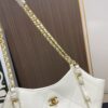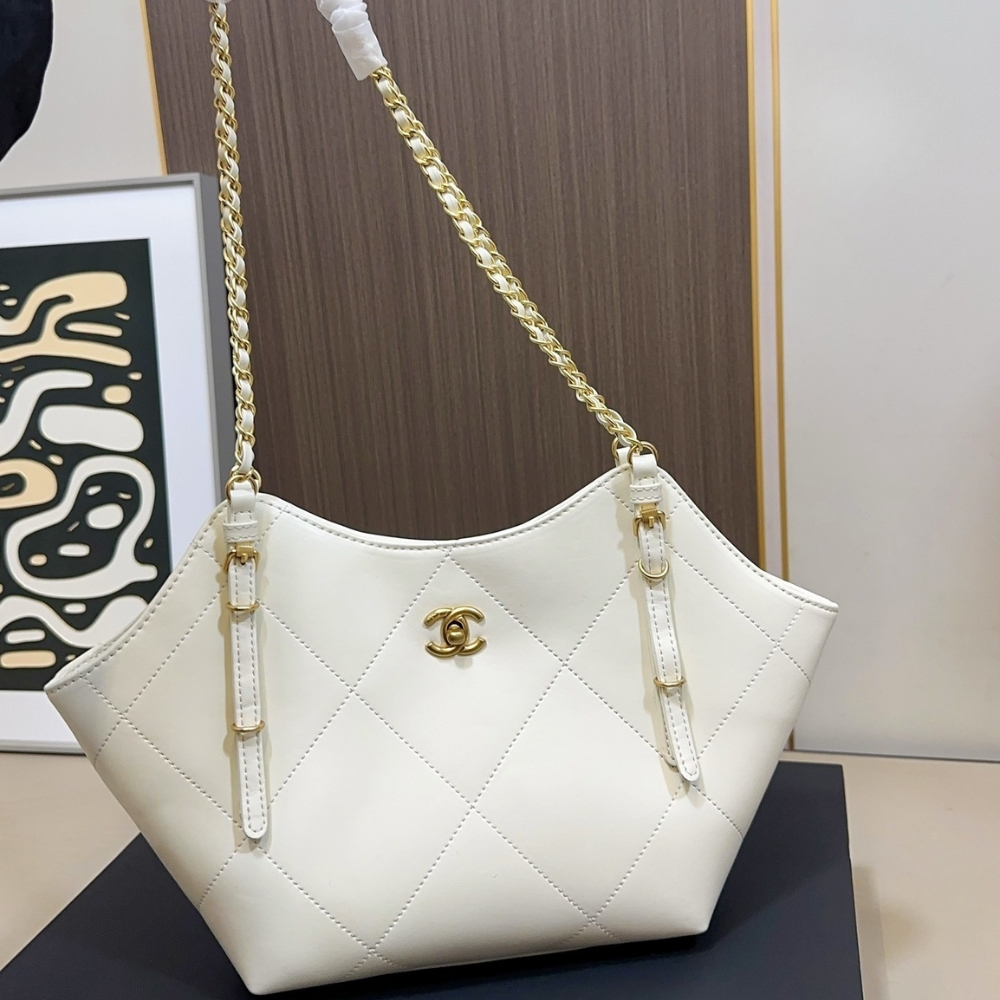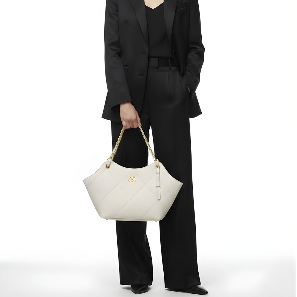 The Chanel Shopping Bag in white is a sophisticated and compact accessory that offers a fresh, modern take on a classic tote. Expertly crafted from smooth leather, this model features the Maison’s signature large-scale diamond quilting and radiant gold-tone metal hardware. The design is highlighted by the iconic interlocking CC logo and versatile leather-interlaced chain straps, making it an elegant choice for both day and evening wear.