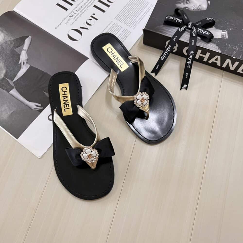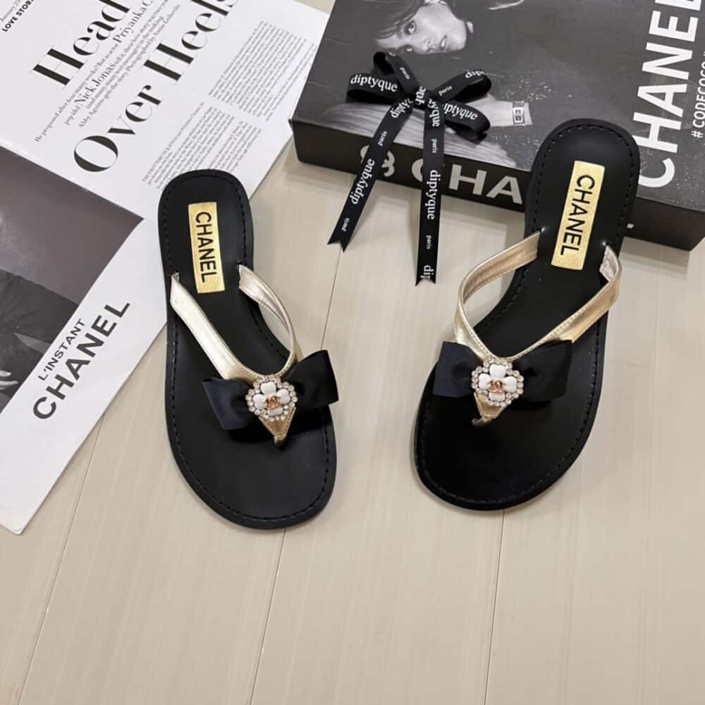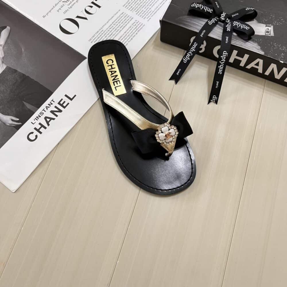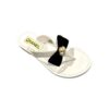 CHANEL THONG SLIDE WHITE CAMELLIA CC LOGO BOW BLACK