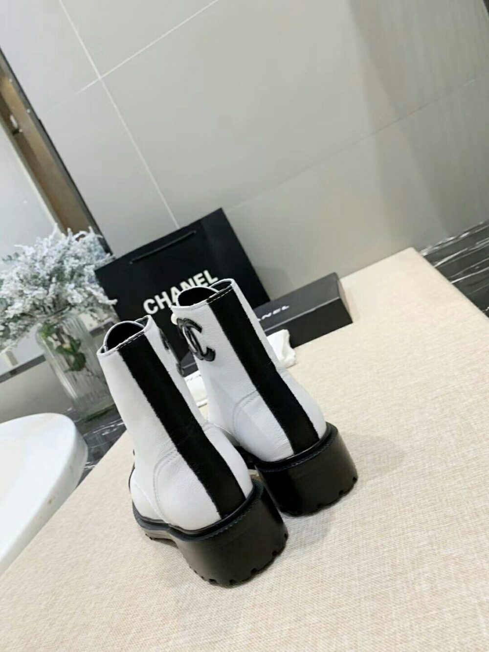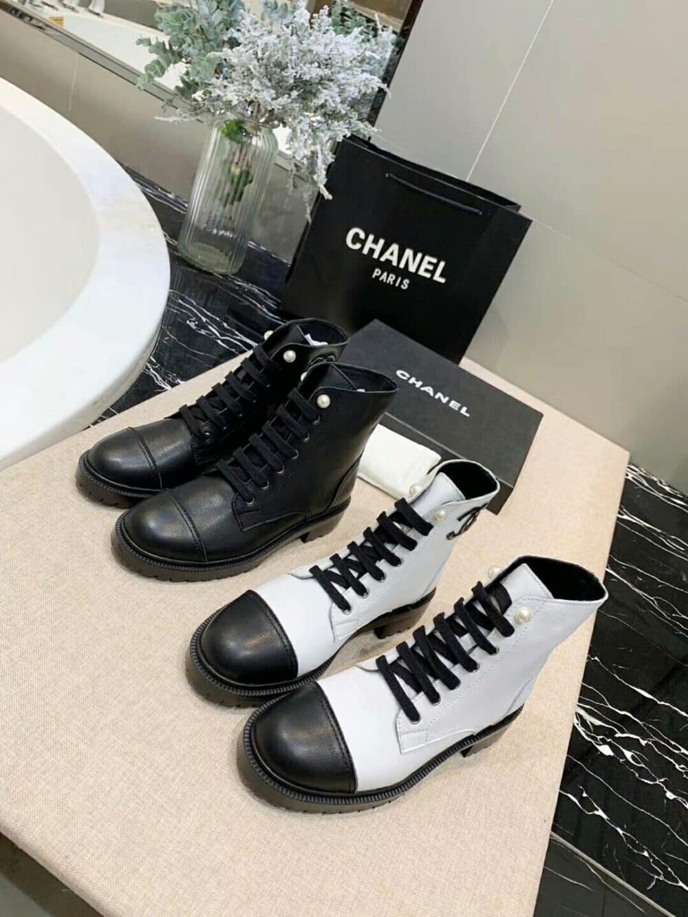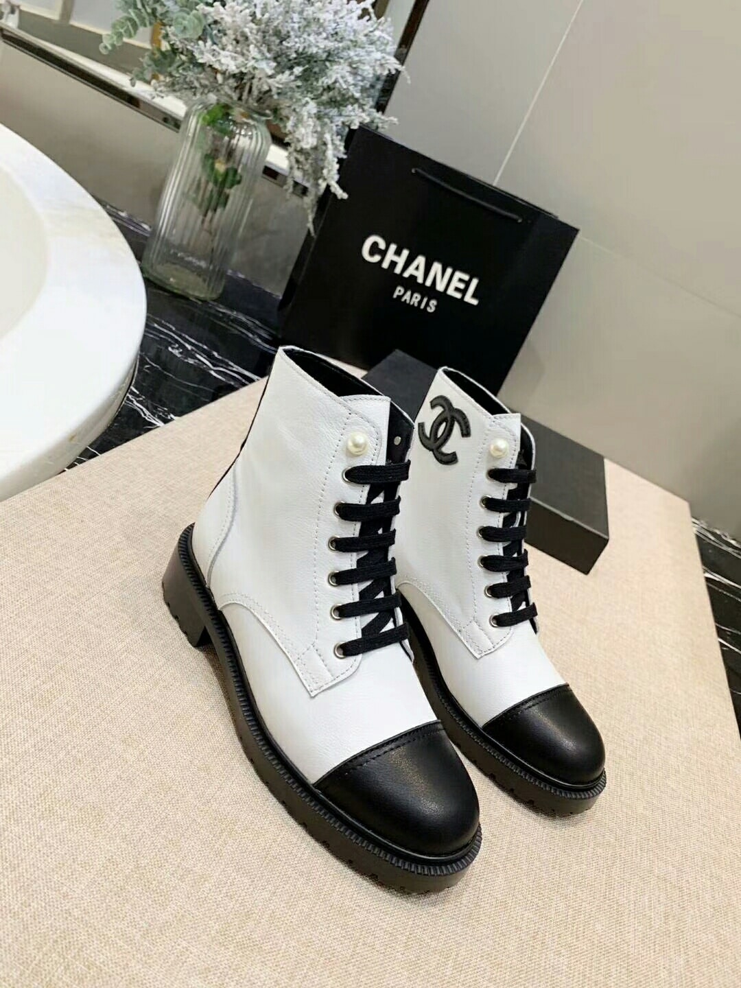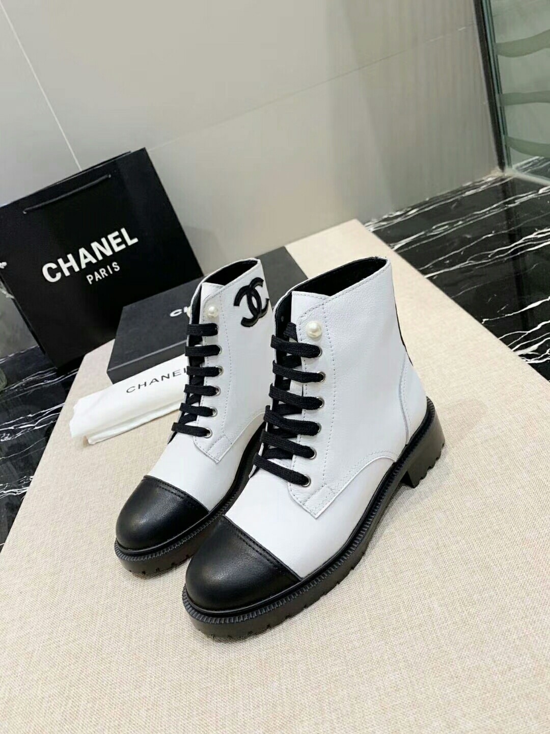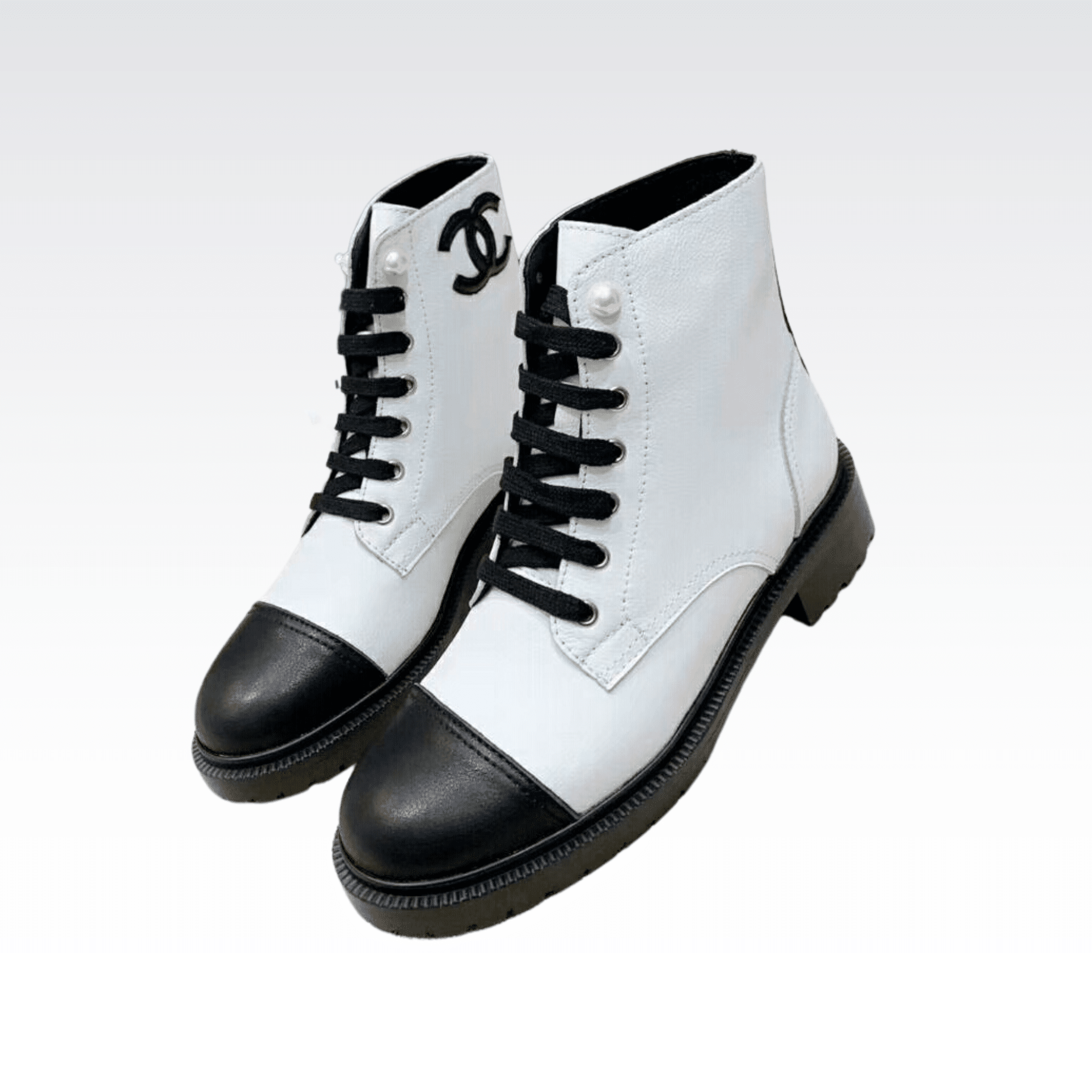 CHANEL WHITE PEARL LOGO CC COMBAT LACE UP TIE ANKLE BOOTS G36209