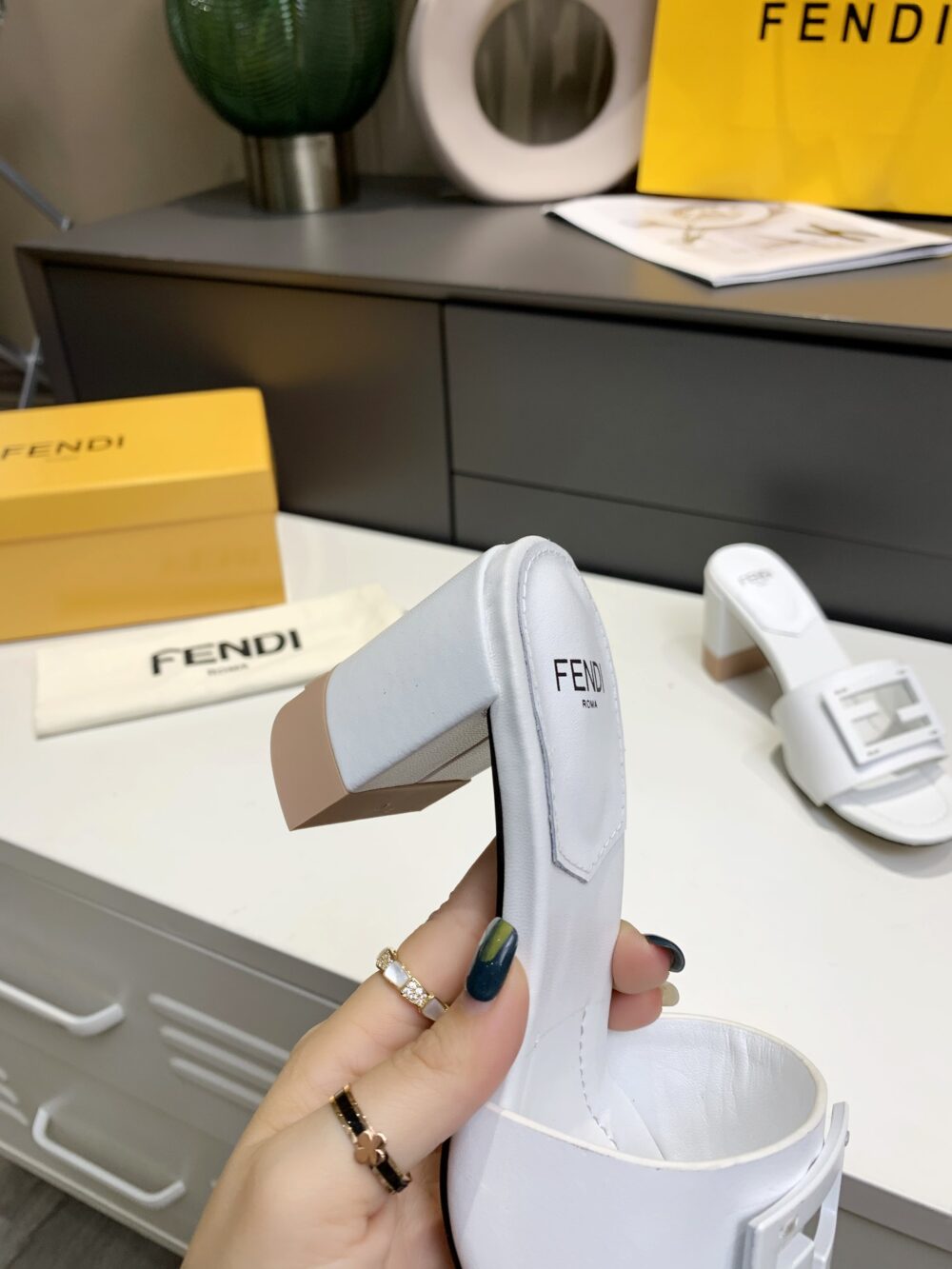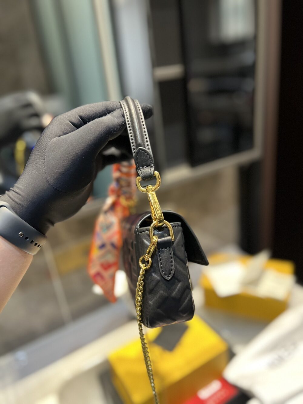 - Embellished with a handle with metal FENDI lettering that can be hooked either to the bag or to the shoulder strap