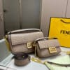 Fendi Baguette Chain Midi Leather Bag Beige With FF Motif features a refined silhouette crafted from smooth leather, highlighted by the iconic FF motif. Designed for everyday elegance, it offers a compact yet functional interior with a stylish chain strap for versatile wear. A timeless piece that pairs effortlessly with both casual and polished outfits.