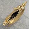 - Zipper closure with fabric-lined internal compartment, gold-finish metalware.