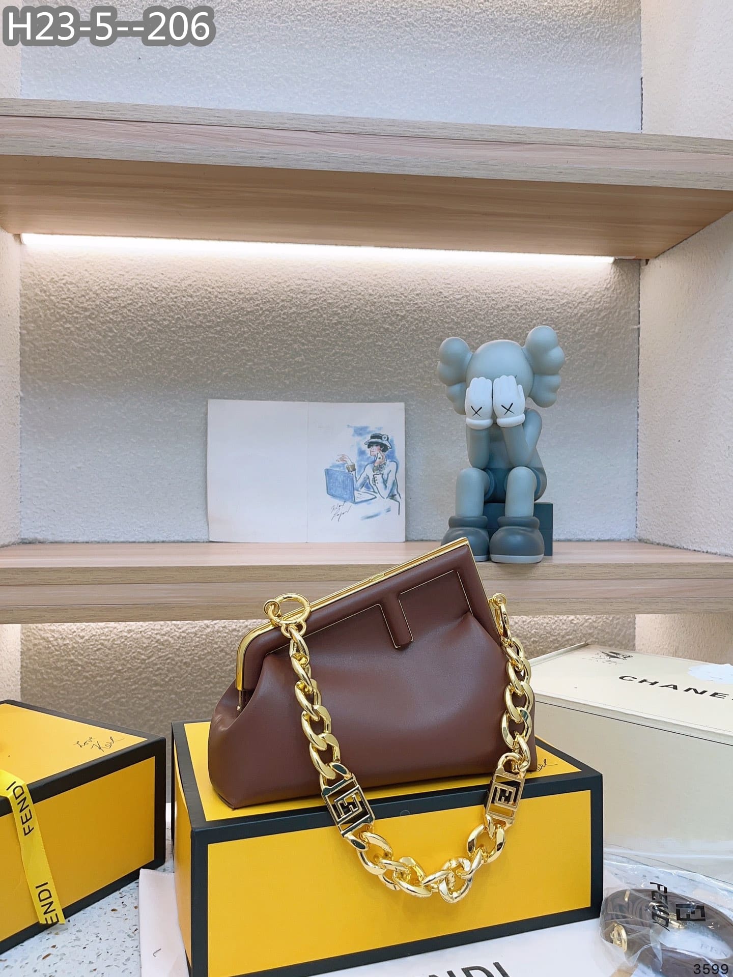 FENDI FIRST WITH CHAIN LEATHER BAG DARK BROWN 24CM