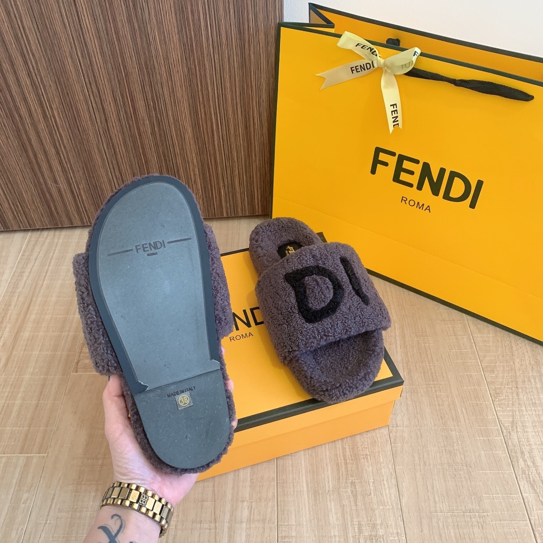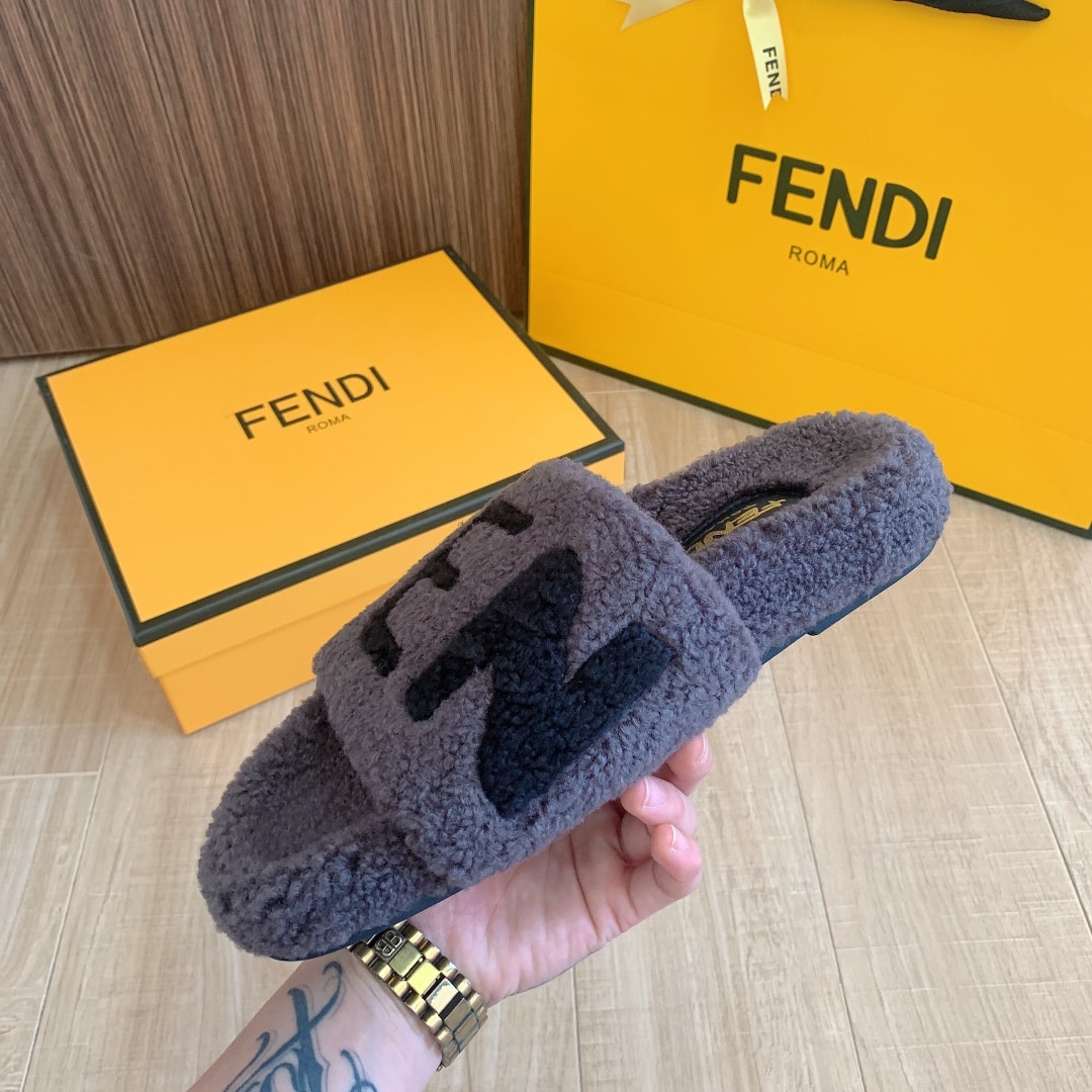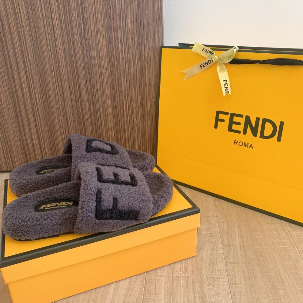 FENDI FLEECE BLACK TEXT SLIPPERS GREY
