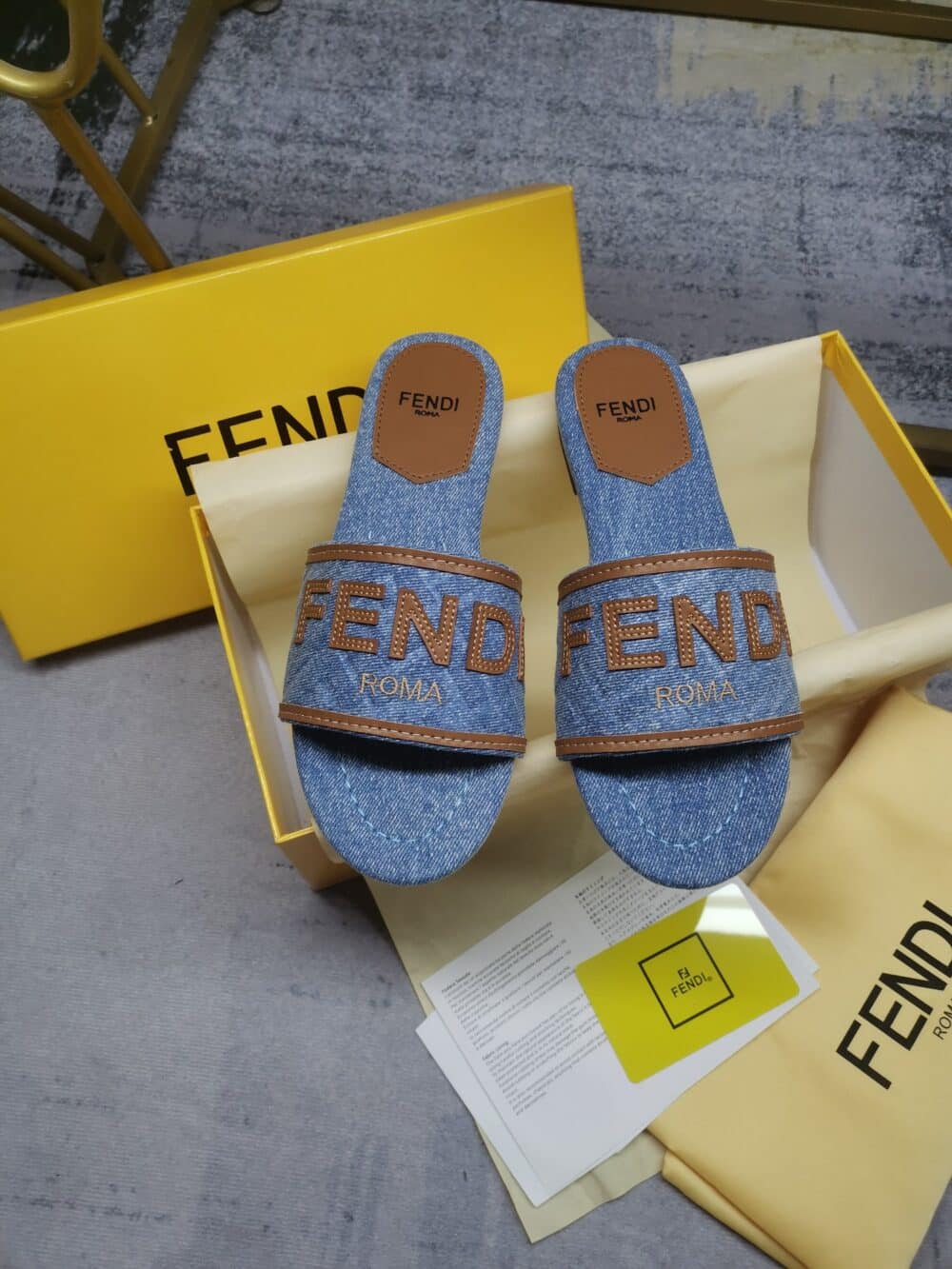 FENDI SIGNATURE LIGHT BLUE DENIM SLIDES
