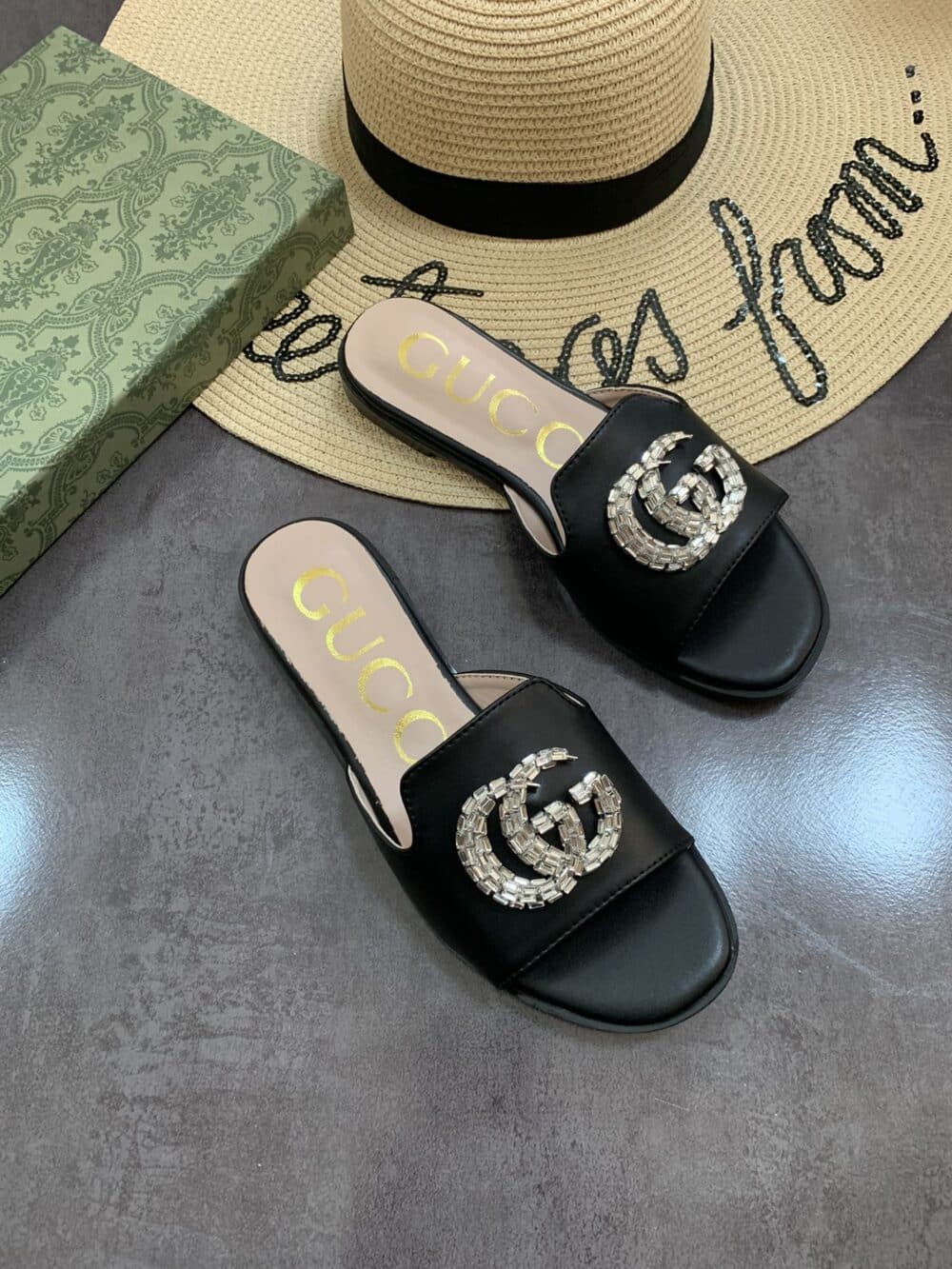 GUCCI DOUBLE G SLIPPERS LEATHER BEADED IN BLACK
