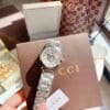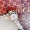 Silver feline head dial with silver-tone hands and Gucci charms hour markers.
