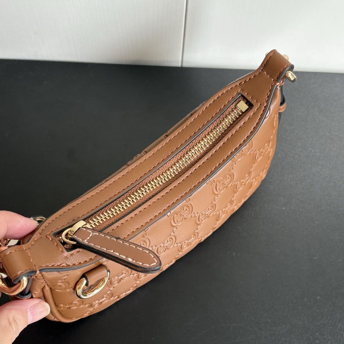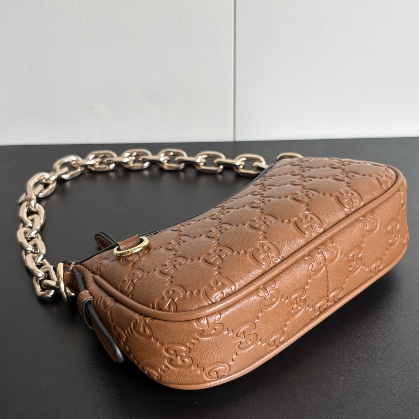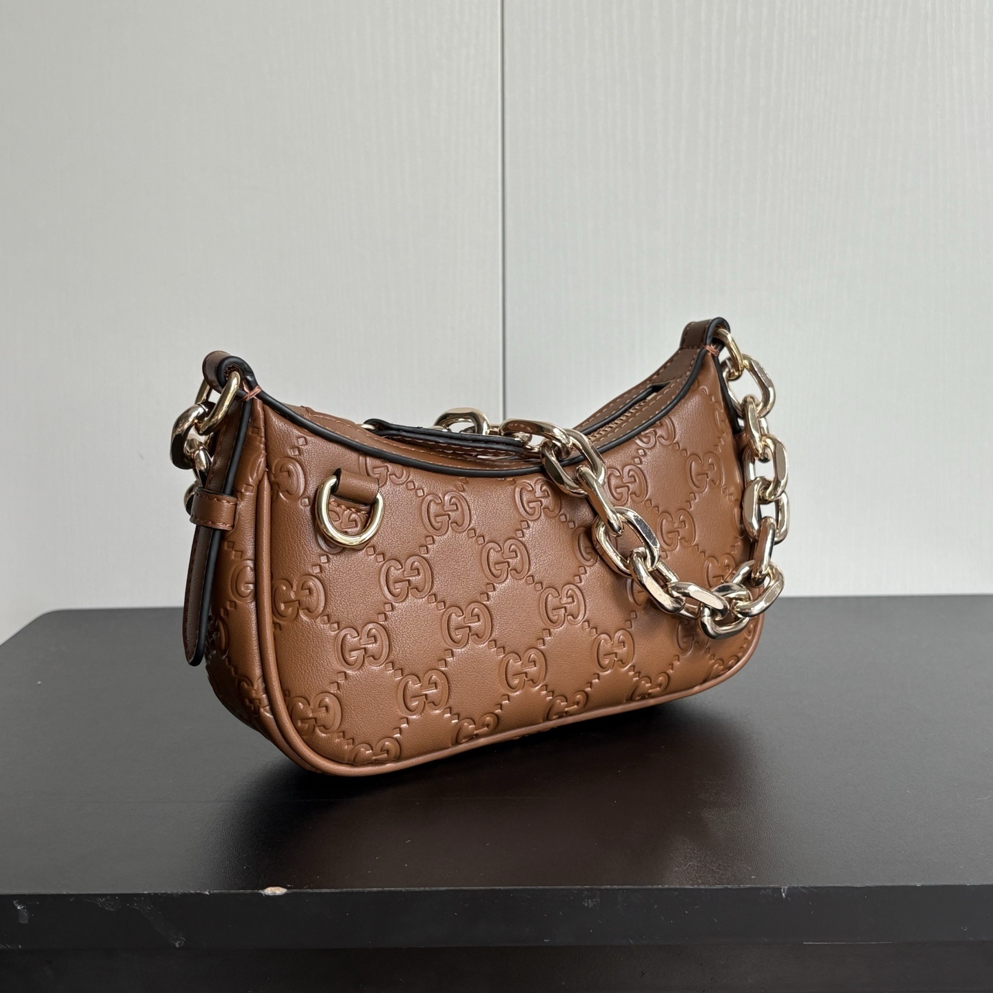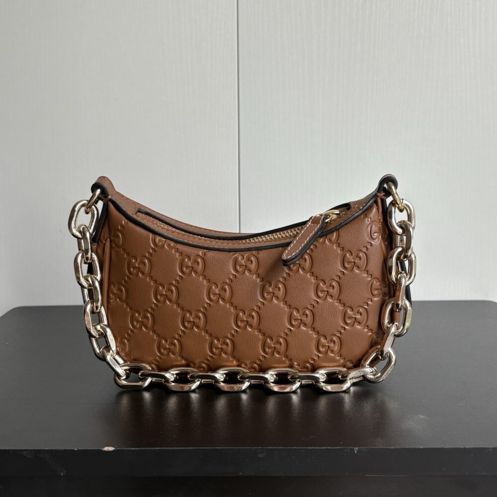 Gucci GG Emblem Mini Shoulder Bag / Brown GG Embossed / 8.7 x 4.1 x 3.5 inches / Gold-toned hardware / Daily Bags