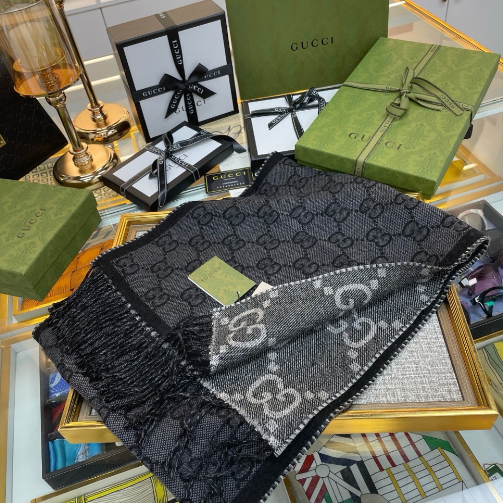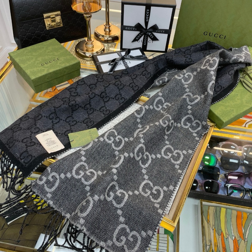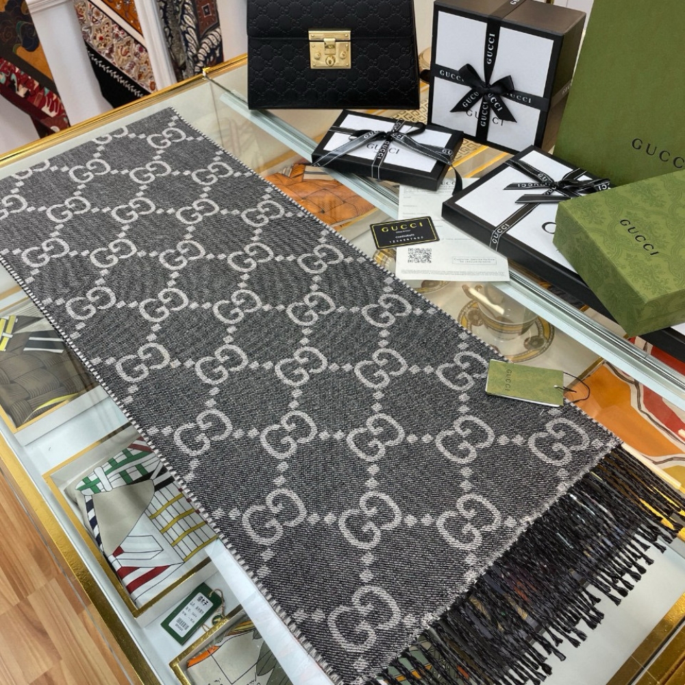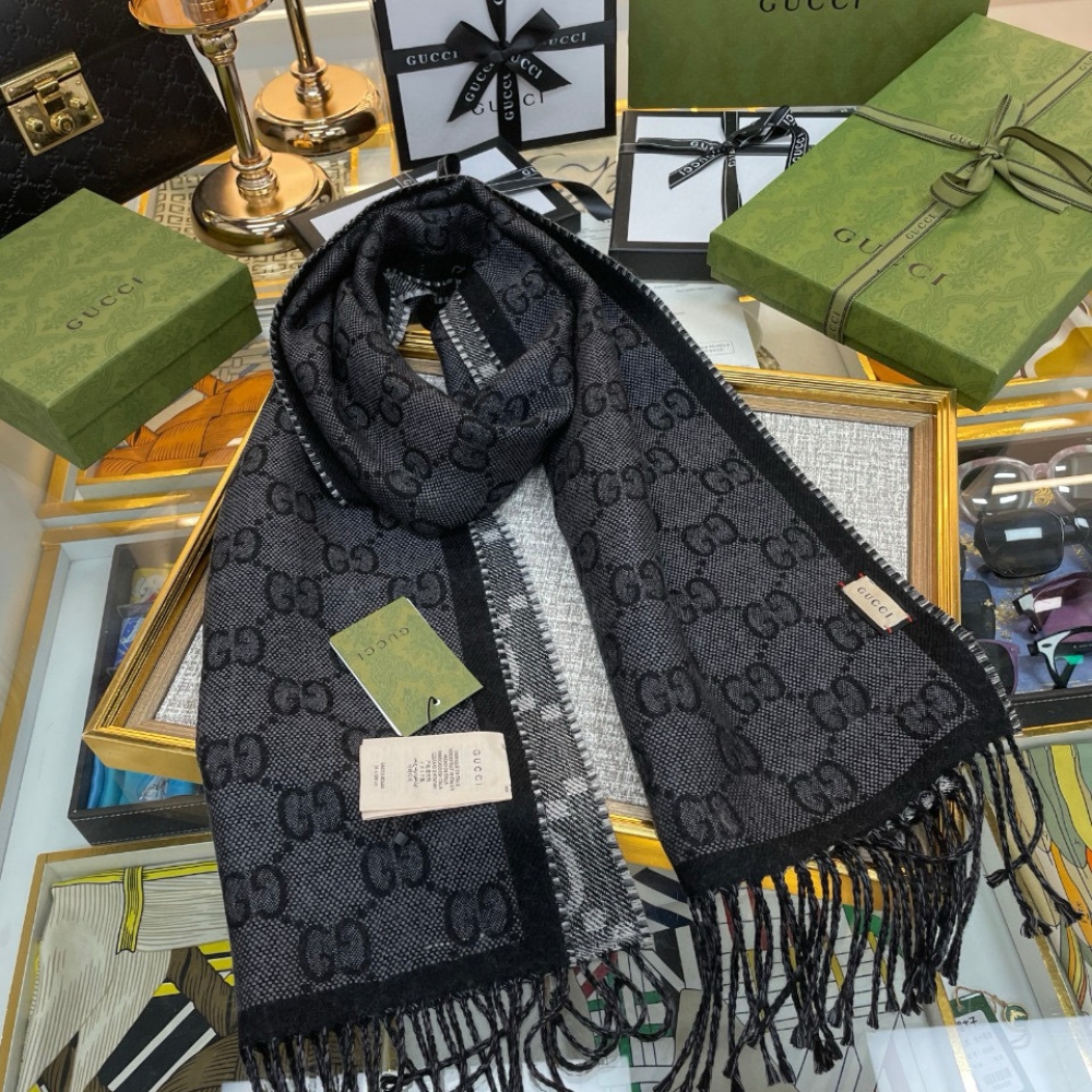 Gucci GG Jacquard Knit Scarf Tassels Gray And Black / 70.9 x 17.8 inches / Wool Scarf / Cozy Scarf