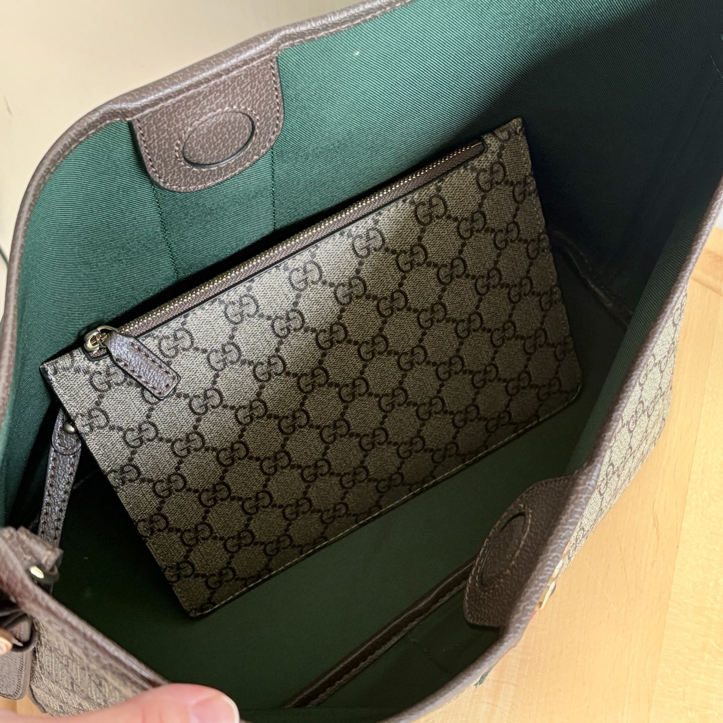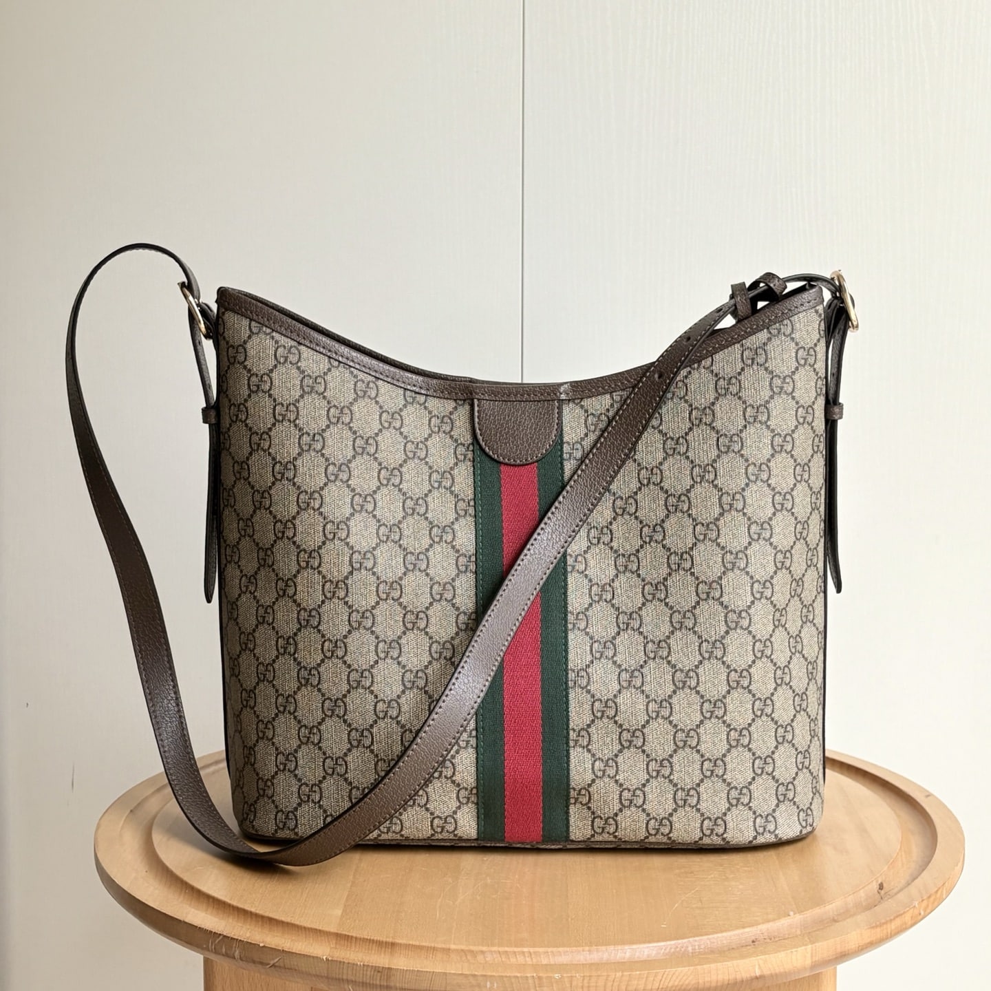 - Beige and dark brown GG Monogram coated fabric