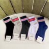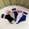 Archival details and refined fabrics characterise a selection of soft accessories that complete the runway’s outfits. Presented in white cotton, this pair of socks is enriched with a red and green Round Interlocking G striped jacquard.