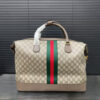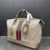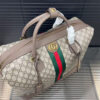 Gucci Savoy in the beige and dark brown palette offers signature silhouettes, crafted with a soft touch. This duffle bag is presented in GG Monogram coated fabric and enriched with a Double G and Web detail.
