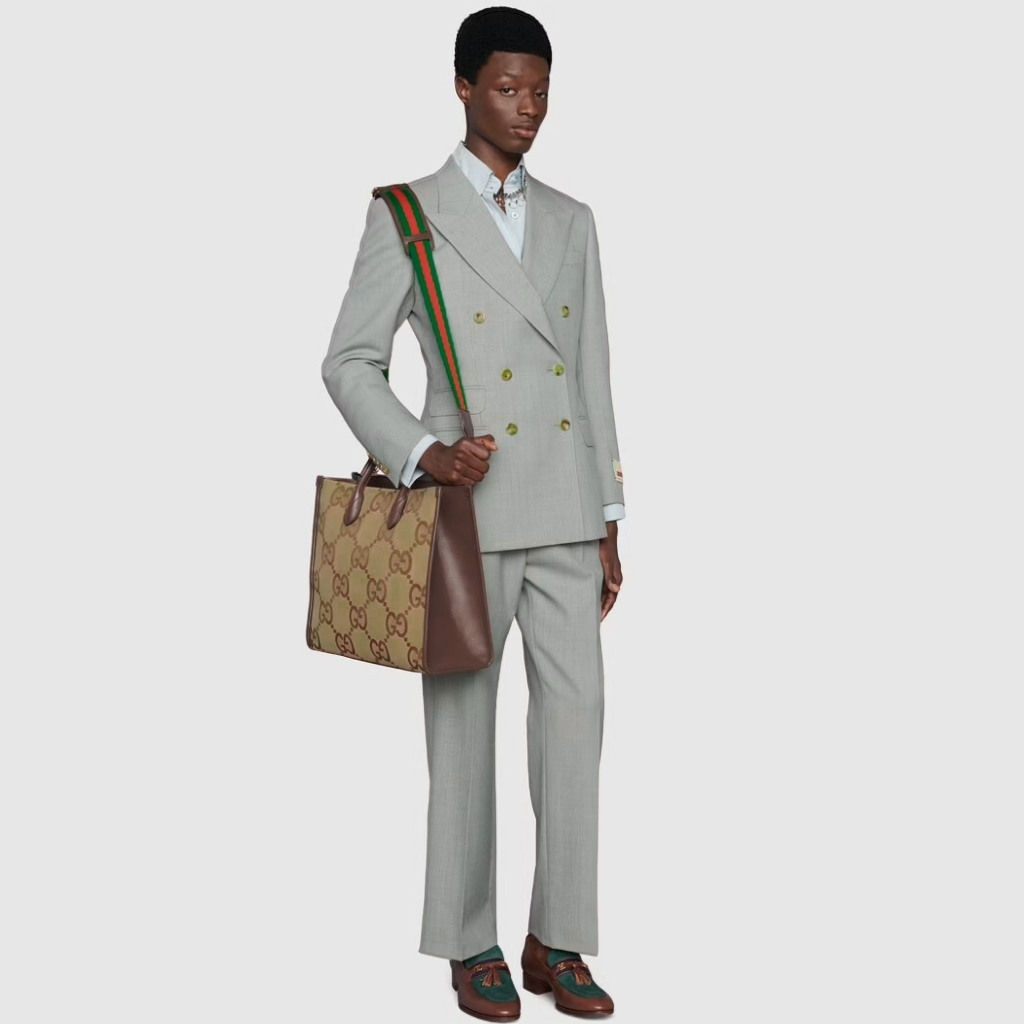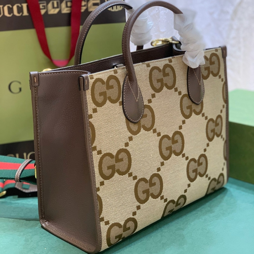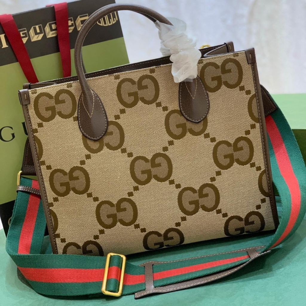 A statement everyday tote featuring Gucci’s iconic Jumbo GG canvas in a warm camel-ebony tone. The structured silhouette is elevated with brown leather trim and a bold green-red Web strap, giving it that unmistakable heritage vibe.