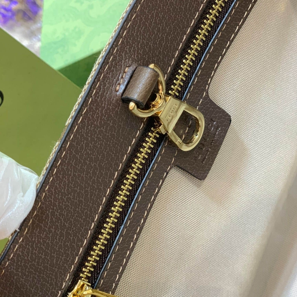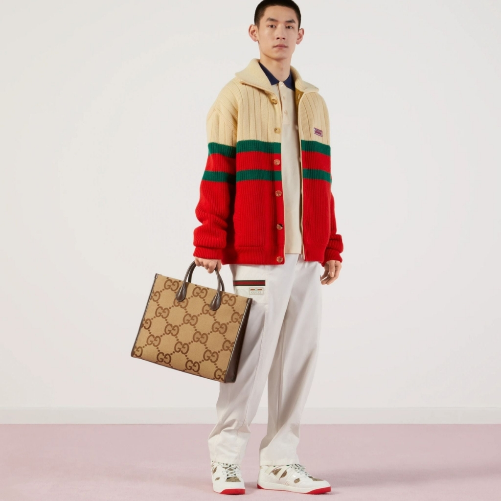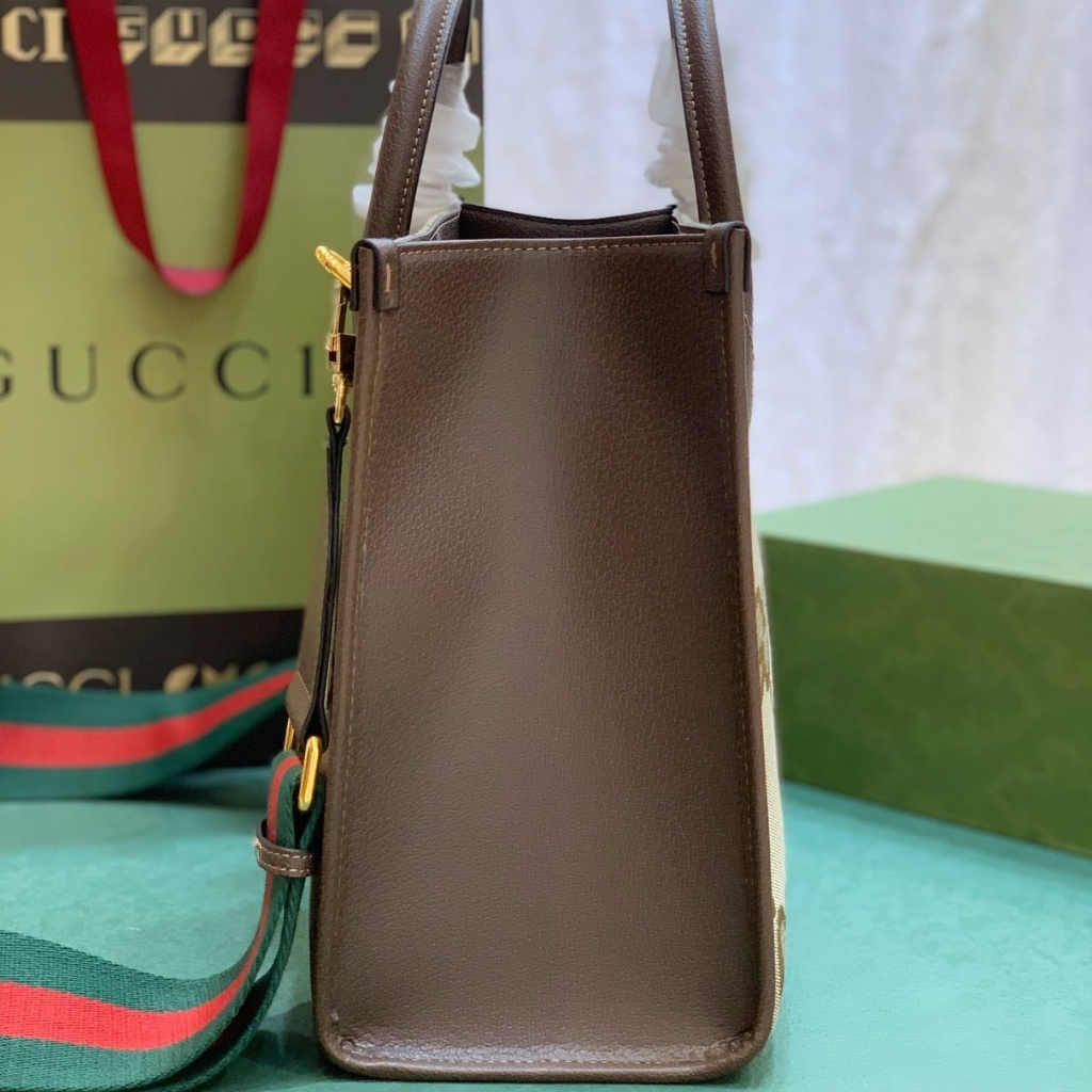 A statement everyday tote featuring Gucci’s iconic Jumbo GG canvas in a warm camel-ebony tone. The structured silhouette is elevated with brown leather trim and a bold green-red Web strap, giving it that unmistakable heritage vibe.