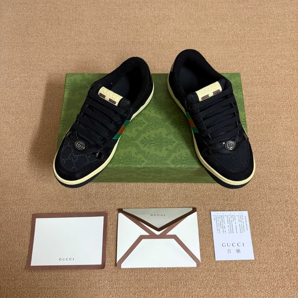 Influenced by classic sneakers from the 1970s, the Screener sneakers is named for the defensive sports move. This variation, in classic leather, features the unique green and red Web stripe on the side and the vintage Gucci logo complete the style.