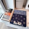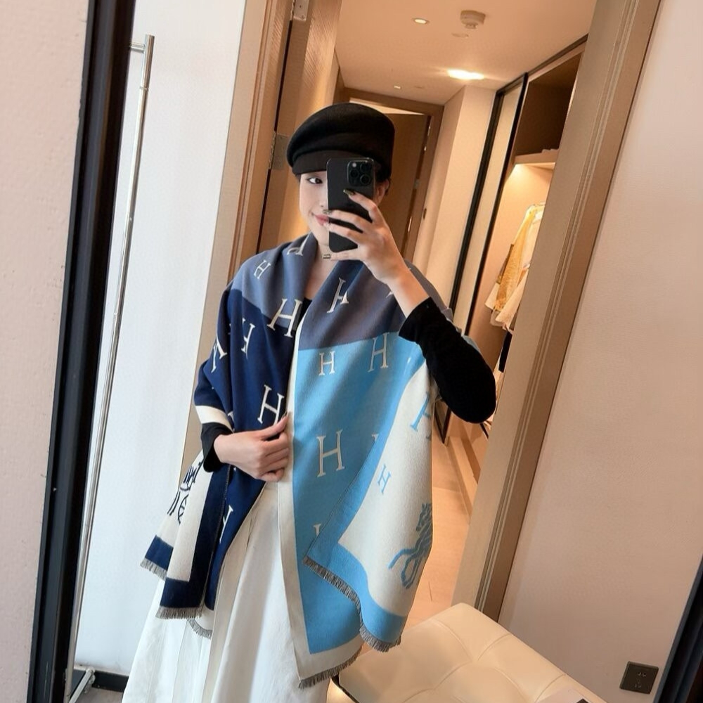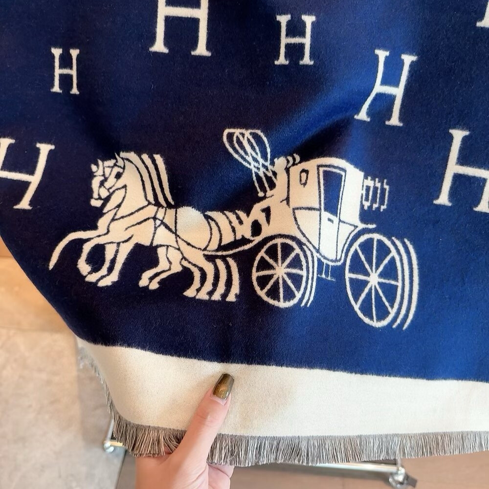 The Hermes Equipage Equestrian Horse H Scarf is a accessory that showcases the Maison’s heritage through a blend of wool and cashmere. It features a modern bi-color blue design adorned with scattered “H” logos and a large “Caleche” horse-drawn carriage motif at the base. The jacquard weave ensures the intricate pattern is visible on both sides, while delicate fringed edges complete its refined look. With its generous proportions, this versatile piece can be styled as a long scarf or a sophisticated shawl for any occasion.