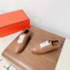 These Hermès sneakers boast an elegant and sophisticated look. The minimalist design is highlighted by an embroidered “H” logo on the side, paired with white laces and a contrasting brown rubber sole. These sneakers are designed for comfort and style, perfect for those who appreciate luxury.